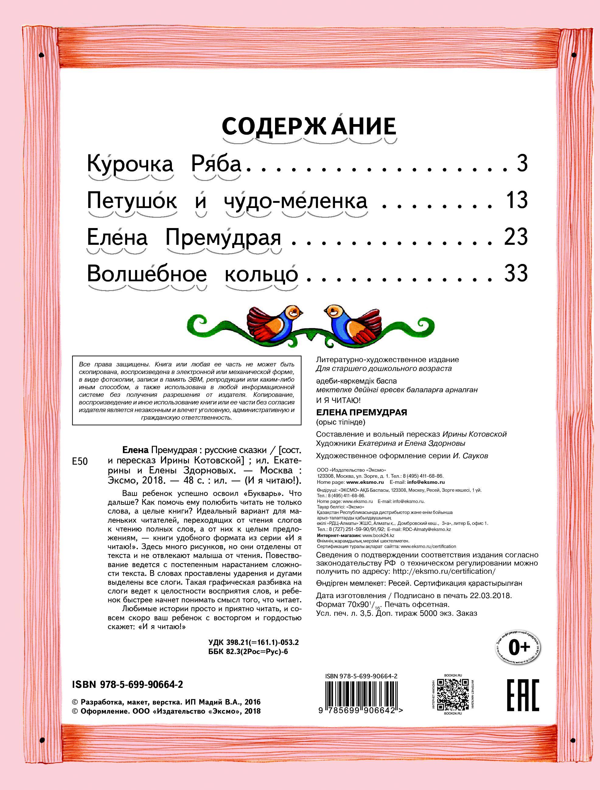 Ваш ребенок успешно освоил «Букварь», что дальше? Как помочь ему полюбить читать не только слова, а целые книги? Идеальный вариант для маленьких читателей, переходящих от чтения слогов к чтению полных слов, а от них к целым предложениям, - книги удобного формата из серии «И я читаю». Здесь много рисунков, но они отделены от текста и не отвлекают малыша от чтения. Повествование ведется с постепенным нарастанием сложности текста. В словах проставлены ударения и дугами выделены все слоги. Такая графическая разбивка на слоги ведет к целостности восприятия слов, и ребенок быстрее начнет понимать смысл того, что читает. Любимые истории просто и приятно читать, и совсем скоро ваш ребенок с восторгом и гордостью скажет: «И я читаю!» В небольшую книгу вошли 4 сказки: «Курочка Ряба», «Петушок и чудо-меленка», «Елена Премудрая», «Волшебное кольцо». Чтобы ребенок, успешно освоивший «Букварь», легко сделал следующие шаги к чтению с удовольствием, ему на помощь спешат книги из серии «И я читаю!». По своему построению и особенностям каждая книга серии представляет собой тренажер по чтению: • Слова разбиты на слоги, которые выделены дугами, что облегчает чтение. • Повествование ведется с постепенным нарастанием сложности текста. • В словах проставлены ударения. • Книгу удобного формата легко носить с собой. • Красочные картинки даны отдельно, они не отвлекают малыша от чтения. • Любимые сказки: в каждой книге серии их четыре. В серию входят книги со сказками: «Ведьма и Солнцева сестра», «Волк и семеро козлят», «Волшебная дудочка», «Крошечка-Хаврошечка», «Лиса и журавль», «Поди туда - не знаю куда», «Сивка-Бурка», «Скатерть-самобранка».