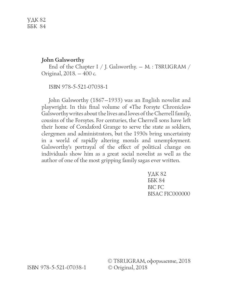 John Galsworthy (1867-1933) was an English novelist and playwright. In this final volume of "The Forsyte Chronicles" Galsworthy writes about the lives and loves of the Cherrell family, cousins of the Forsytes. For centuries, the Cherrell sons have left their home of Condaford Grange to serve the state as soldiers, clergymen and administrators, but the 1930s bring uncertainty in a world of rapidly altering morals and unemployment. Galsworthy's portrayal of the effect of political change on individuals show him as a great social novelist as well as the author of one of the most gripping family sagas ever written.| Издательство | РИПОЛ классик Группа Компаний ООО |