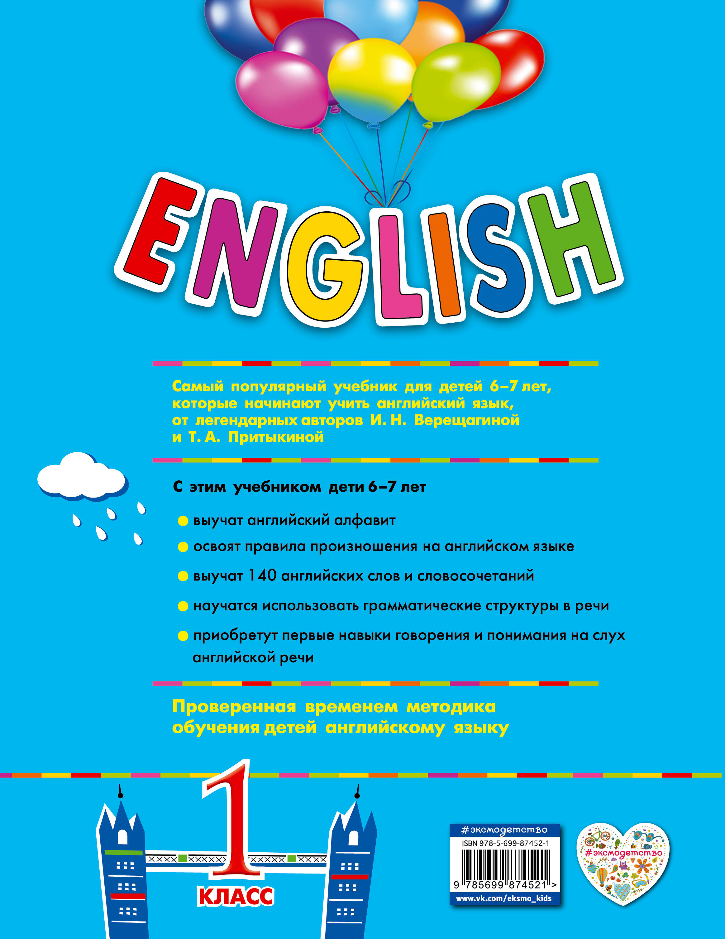 Учебник И.Н. Верещагиной и Т.А. Притыкиной для 1-го класса - это первый шаг к уверенному владению английским языком. Это устный курс английского, который поможет первоклассникам освоить базовые сведения об английской фонетике, лексике и грамматике. Он выстроен с учетом возрастных особенностей детей и поможет научить их говорить по-английски на близкие им темы. Аудиозапись начитана носителями языка, что поможет детям сразу поставить произношение и научиться воспринимать англоязычную речь на слух. Сделать обучение еще более интересным и эффективным помогут другие части учебно-методического комплекта - рабочая тетрадь с заданиями и методические рекомендации для взрослых.| Издательство | ООО "Издательство "Эксмо" |