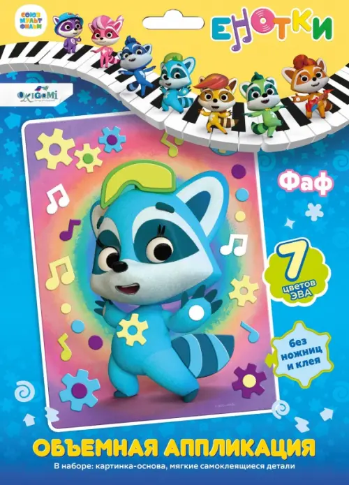 Объемная аппликация с любимыми героями музыкального мультсериала "Енотки" понравится любому ребенку. Сделать такую поделку очень просто! Найдите на картинке области, выделенные пунктиром, и приклейте на них мягкие детали из EVA. Детали накладываются друг на друга в несколько слоев, поэтому малышу нужно будет решить, что приклеить на нижний слой, а что - на верхний. Такое занятие отлично развивает мелкую моторику, логику и усидчивость. А готовой работой можно украсить детскую комнату.