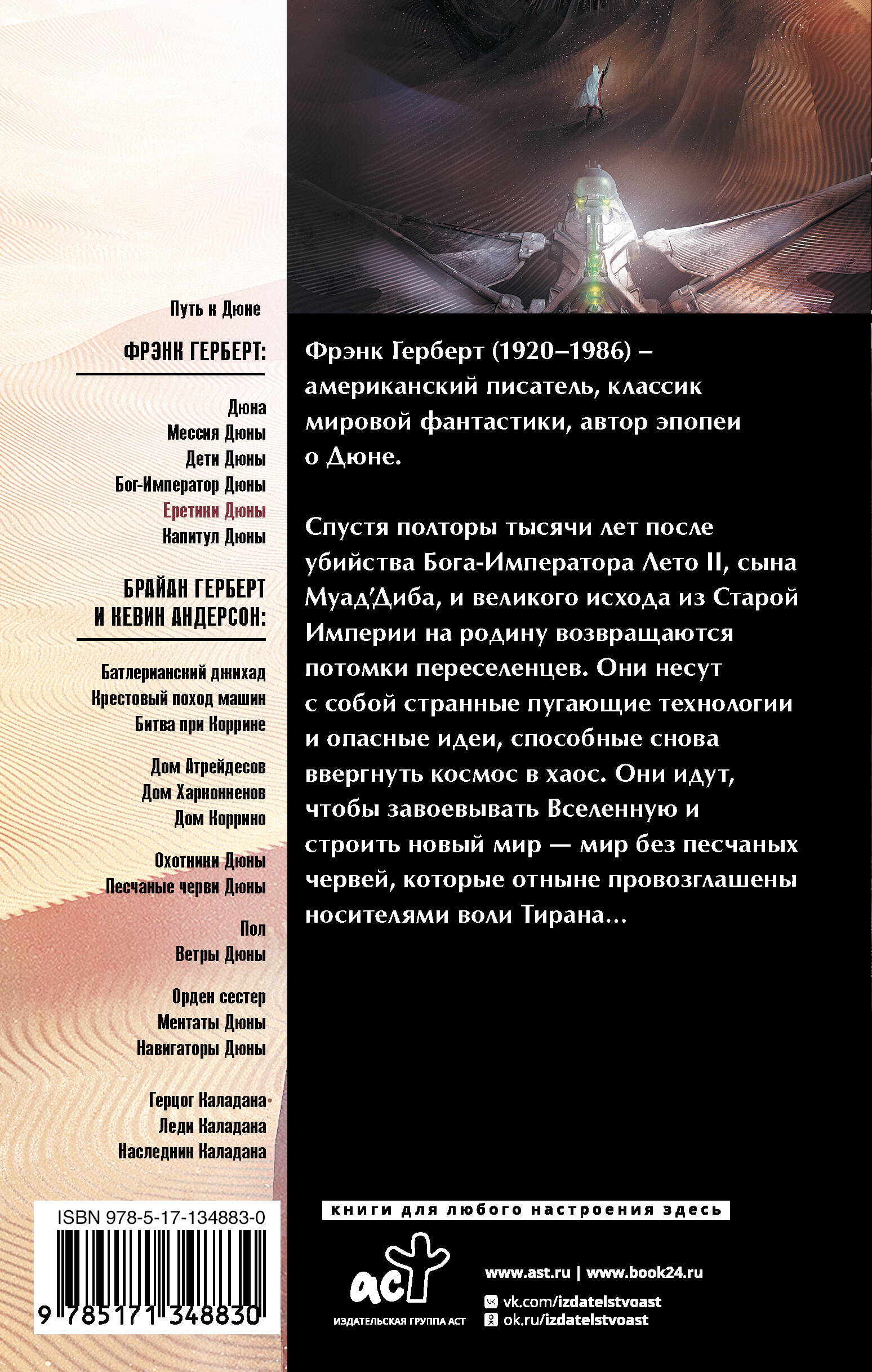 Спустя полторы тысячи лет после убийства Бога-Императора Лето II, сына Муад'Диба, и великого исхода из Старой Империи на родину возвращаются потомки переселенцев. Они несут с собой странные пугающие технологии и опасные идеи, способные снова ввергнуть космос в хаос. Они идут, чтобы завоевывать Вселенную и строить новый мир - мир без песчаных червей, которые отныне провозглашены носителями воли Тирана…| Издательство | Издательство "АСТ" |