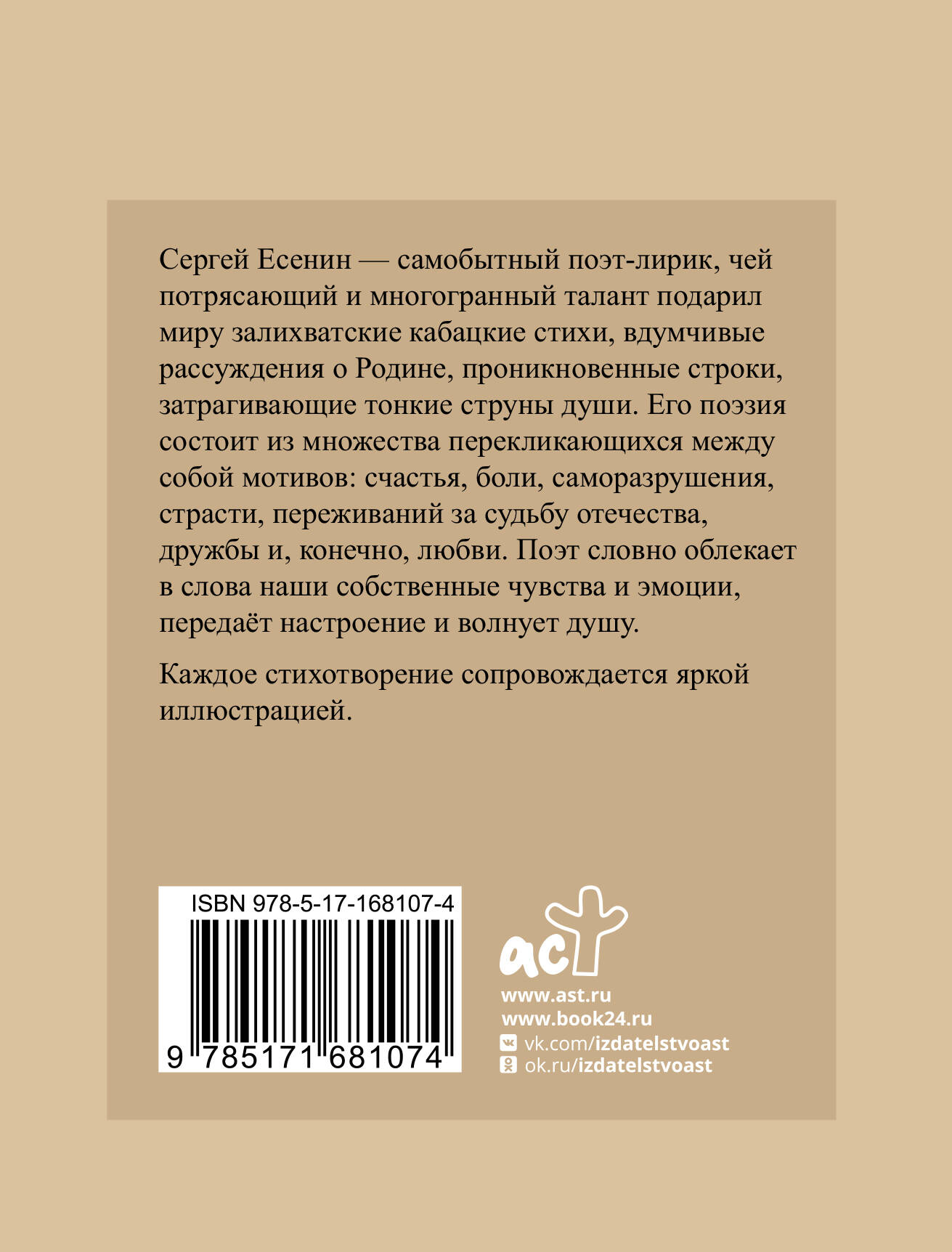Сергей Есенин - самобытный поэт-лирик, чей потрясающий и многогранный талант подарил миру залихватские кабацкие стихи, вдумчивые рассуждения о Родине, проникновенные строки, затрагивающие тонкие струны души. Его поэзия состоит из множества перекликающихся между собой мотивов: счастья, боли, саморазрушения, страсти, переживаний за судьбу отечества, дружбы и, конечно, любви. Поэт словно облекает в слова наши собственные чувства и эмоции, передаёт настроение и волнует душу. Каждое стихотворение сопровождается яркой иллюстрацией.| Издательство | Издательство "АСТ" |