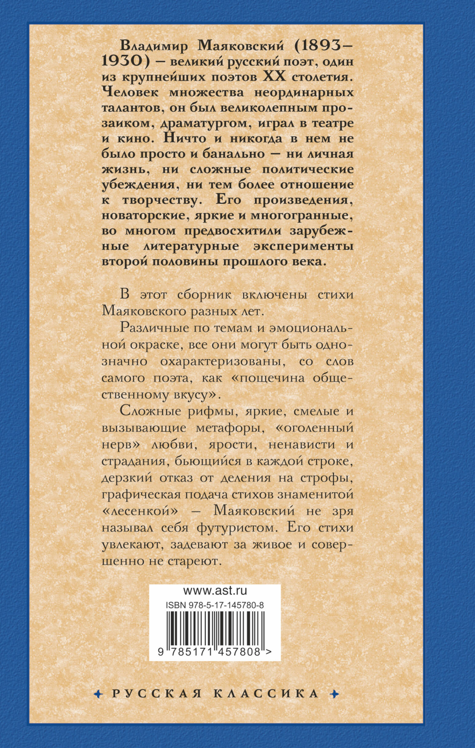 В этот сборник включены стихи Маяковского разных лет. Различные по темам и эмоциональной окраске, все они могут быть однозначно охарактеризованы, со слов самого поэта, как "пощечина общественному вкусу". Сложные рифмы, яркие, смелые и вызывающие метафоры, "оголенный нерв" любви, ярости, ненависти и страдания, бьющийся в каждой строке, дерзкий отказ от деления на строфы, графическая подача стихов знаменитой "лесенкой" - Маяковский не зря называл себя футуристом. Его стихи увлекают, задевают за живое и совершенно не стареют.| Издательство | ИЗДАТЕЛЬСТВО "АСТ" |