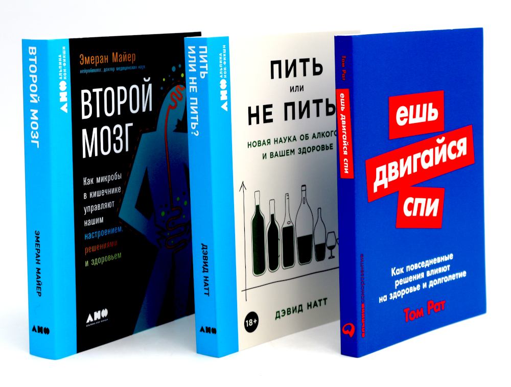 Комплект состоит из трех книг: «Ешь, двигайся, спи», «Пить или не пить» и «Второй мозг». О книге «Ешь, двигайся, спи»: Мы привыкли к тому, что переход к здоровому образу жизни требует каких то кардинальных перемен, например полного отказа от никотина и алкоголя, регулярных спортивных занятий, смены места жительства. Во многом поэтому мы не уделяем должного внимания «мелочам» - ежедневным решениям по поводу того, что съесть на завтрак: овсянку или бутерброд? Позвонить коллеге или пройтись до его кабинета? Лечь поспать пораньше или позволить себе немного расслабиться и посмотреть допоздна любимый сериал? А ведь именно эти «мелочи», как утверждает Том Рат, оказывают существенное влияние на продолжительность и качество нашей жизни. Автор выработал простую методику, которая позволяет ему, имея тяжелое заболевание, вести активный образ жизни и заниматься любимым делом. Методика базируется на трех основных принципах - качественный сон, постоянное движение и правильная еда. Не важно, какой образ жизни вы ведете сегодня, всегда можно измениться, чтобы прожить долгую и полноценную жизнь. О том, какие именно привычки стоит изменить, что и когда есть и как добавить в свою жизнь больше движения, читайте в этой книге. О книге «Пить или не пить»: Мы привыкли считать алкоголь неотъемлемой частью обыденной жизни - от стаканчика с коллегами после работы до ежедневного бокала вина перед сном. В своей книге британский психиатр и нейропсихофармаколог Дэвид Натт постарался простым языком ответить на бесчисленные вопросы, связанные с уходящим в тьму веков симбиозом человекаи этанола. Почему алкоголь - наркотик? Как он действует на нашу психику? Как избежать похмелья? Почему от пьянства особенно страдает печень? Каковы социальные преимущества выпивки? Как понять, что у тебя формируется зависимость? Бывают ли успешные алкоголики? Какие стратегии помогают контролировать употребление алкоголя? Виноват ли алкоголик в своем положении? Как работают различные лекарственные препараты? Что должны предпринимать в этой связи правительства? Вся эта информация, подкрепленная самыми современными научными данными, должна помочь каждому из нас определить для себя ту идеальную дозу спиртного, которая принесет максимальную радость при минимальном вре. О книге «Второй мозг»: Могут ли микробы влиять на наши эмоции и поступки? Оказывается, они способны не только на это, но и на многое другое! Доктор медицинских наук Эмеран Майер представляет в своей книге революционный взгляд на устройство человеческого организма и на то, какую роль в нем играет взаимодействие между головным мозгом и желудочно-кишечным трактом. Триллионы микроорганизмов, обитающих в кишечнике, находятся в постоянной связи друг с другом и с головным мозгом, и именно от нее во многом зависит и наше общее состояние, и даже принятие жизненных решений. Кроме того, сбои в этом взаимодействии ведут к развитию депрессии, аутизма, деменции и болезни Паркинсона. Автор убедительно показывает, что здоровье организма и борьба с серьезными хроническими заболеваниями невозможны без налаживания правильного диалога со своими микробами.| Издательство | Альпина нон-фикшн |