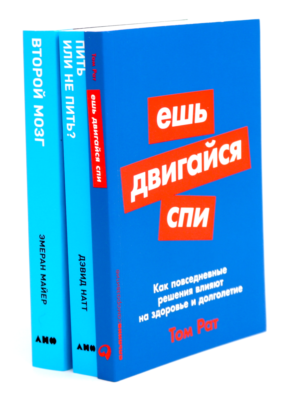 Комплект состоит из трех книг: «Ешь, двигайся, спи», «Пить или не пить» и «Второй мозг». О книге «Ешь, двигайся, спи»: Мы привыкли к тому, что переход к здоровому образу жизни требует каких то кардинальных перемен, например полного отказа от никотина и алкоголя, регулярных спортивных занятий, смены места жительства. Во многом поэтому мы не уделяем должного внимания «мелочам» - ежедневным решениям по поводу того, что съесть на завтрак: овсянку или бутерброд? Позвонить коллеге или пройтись до его кабинета? Лечь поспать пораньше или позволить себе немного расслабиться и посмотреть допоздна любимый сериал? А ведь именно эти «мелочи», как утверждает Том Рат, оказывают существенное влияние на продолжительность и качество нашей жизни. Автор выработал простую методику, которая позволяет ему, имея тяжелое заболевание, вести активный образ жизни и заниматься любимым делом. Методика базируется на трех основных принципах - качественный сон, постоянное движение и правильная еда. Не важно, какой образ жизни вы ведете сегодня, всегда можно измениться, чтобы прожить долгую и полноценную жизнь. О том, какие именно привычки стоит изменить, что и когда есть и как добавить в свою жизнь больше движения, читайте в этой книге. О книге «Пить или не пить»: Мы привыкли считать алкоголь неотъемлемой частью обыденной жизни - от стаканчика с коллегами после работы до ежедневного бокала вина перед сном. В своей книге британский психиатр и нейропсихофармаколог Дэвид Натт постарался простым языком ответить на бесчисленные вопросы, связанные с уходящим в тьму веков симбиозом человекаи этанола. Почему алкоголь - наркотик? Как он действует на нашу психику? Как избежать похмелья? Почему от пьянства особенно страдает печень? Каковы социальные преимущества выпивки? Как понять, что у тебя формируется зависимость? Бывают ли успешные алкоголики? Какие стратегии помогают контролировать употребление алкоголя? Виноват ли алкоголик в своем положении? Как работают различные лекарственные препараты? Что должны предпринимать в этой связи правительства? Вся эта информация, подкрепленная самыми современными научными данными, должна помочь каждому из нас определить для себя ту идеальную дозу спиртного, которая принесет максимальную радость при минимальном вре. О книге «Второй мозг»: Могут ли микробы влиять на наши эмоции и поступки? Оказывается, они способны не только на это, но и на многое другое! Доктор медицинских наук Эмеран Майер представляет в своей книге революционный взгляд на устройство человеческого организма и на то, какую роль в нем играет взаимодействие между головным мозгом и желудочно-кишечным трактом. Триллионы микроорганизмов, обитающих в кишечнике, находятся в постоянной связи друг с другом и с головным мозгом, и именно от нее во многом зависит и наше общее состояние, и даже принятие жизненных решений. Кроме того, сбои в этом взаимодействии ведут к развитию депрессии, аутизма, деменции и болезни Паркинсона. Автор убедительно показывает, что здоровье организма и борьба с серьезными хроническими заболеваниями невозможны без налаживания правильного диалога со своими микробами.| Издательство | Альпина нон-фикшн |