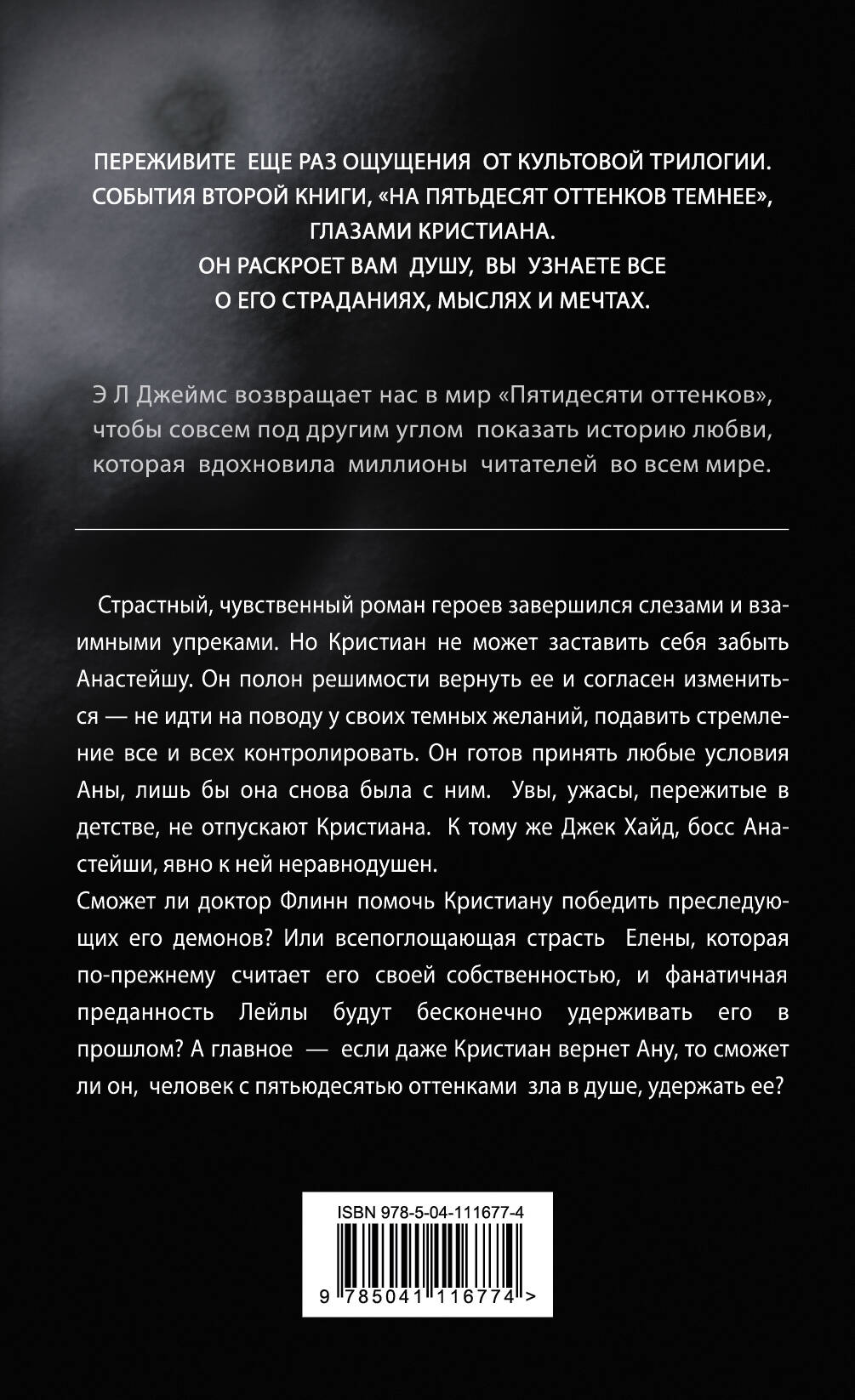 Э. Л. Джеймс возвращает нас в мир «Пятидесяти оттенков», чтобы совсем под другим углом показать историю любви, которая вдохновила миллионы читателей во всем мире. Анастейше пришлось через многое пройти, чтобы принять Кристиана таким, какой он есть. И многое преодолеть, чтобы победить пятьдесят оттенков зла в его душе. Но и сам Кристиан многое пережил и сильно изменился после знакомства с Анастейшей и готов на все ради того, чтобы сохранить их отношения. И, как всегда, на пути влюбленных встают люди, которые хотят во что бы то ни стало помешать их счастью. Елена, которая по-прежнему считает Кристиана своей собственностью, и Лейла, которая остается ему фанатично предана, не дают ему забыть прошлое, где живут мучающие его демоны.| Издательство | ООО "Издательство "Эксмо" |