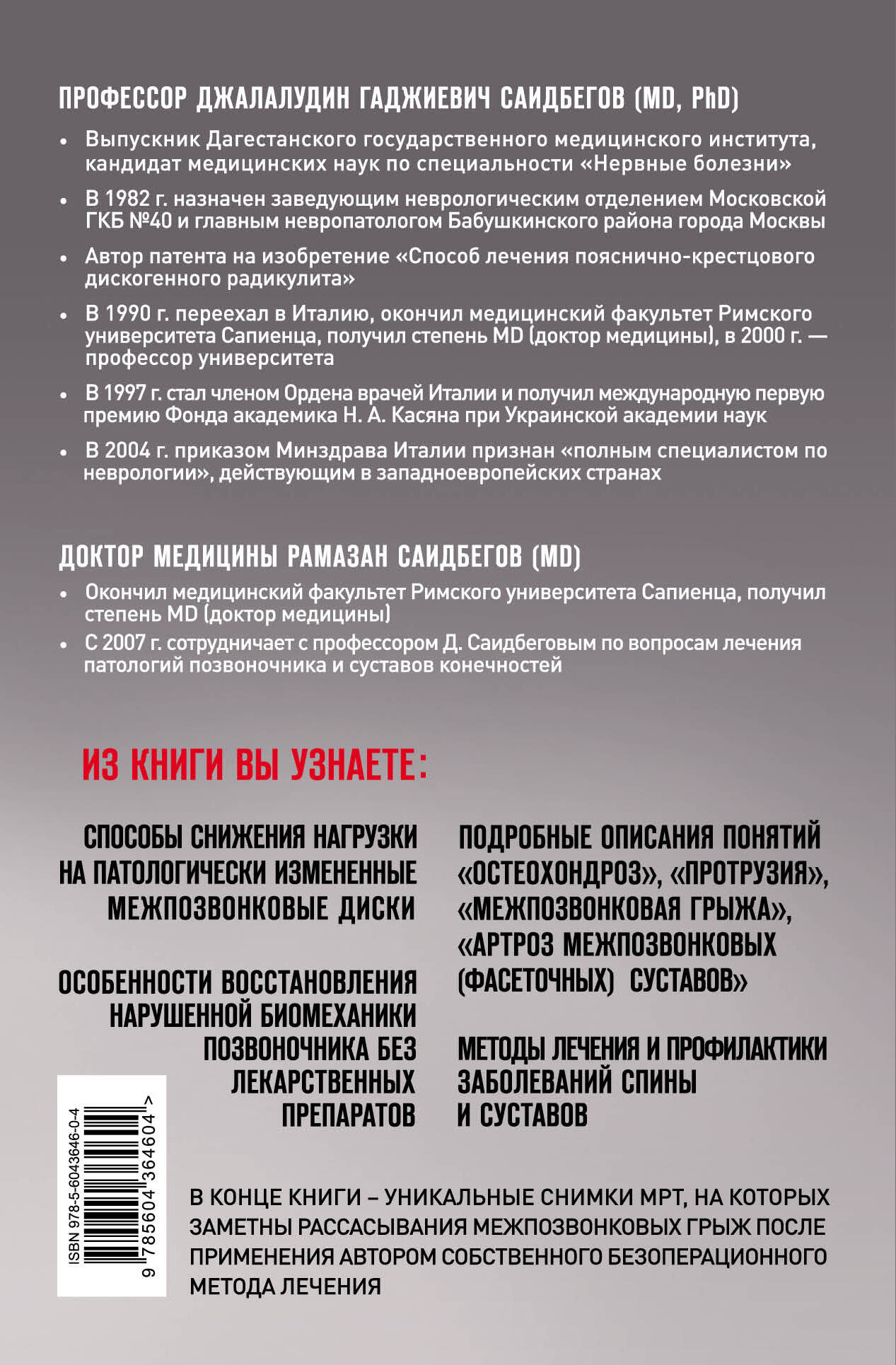 Как восстановить позвоночник без лекарственных препаратов, избавиться от боли в спине и суставах? Об этом расскажут квалифицированные авторы - профессор Д. Г. Саидбегов и доктор медицины Р. Д. Саидбегов, которые более 33 лет занимаются лечением патологий суставов и позвоночника по уникальной методике. В книге вы найдете методы лечения и профилактики заболеваний спины и суставов, а также способы снижения нагрузки на патологически измененные межпозвонковые диски. Книга рассчитана на врачей общего профиля (терапевтов) и на больных (пациентов), страдающих проблемами позвоночника.| Издательство | ООО "Издательство "Эксмо" |