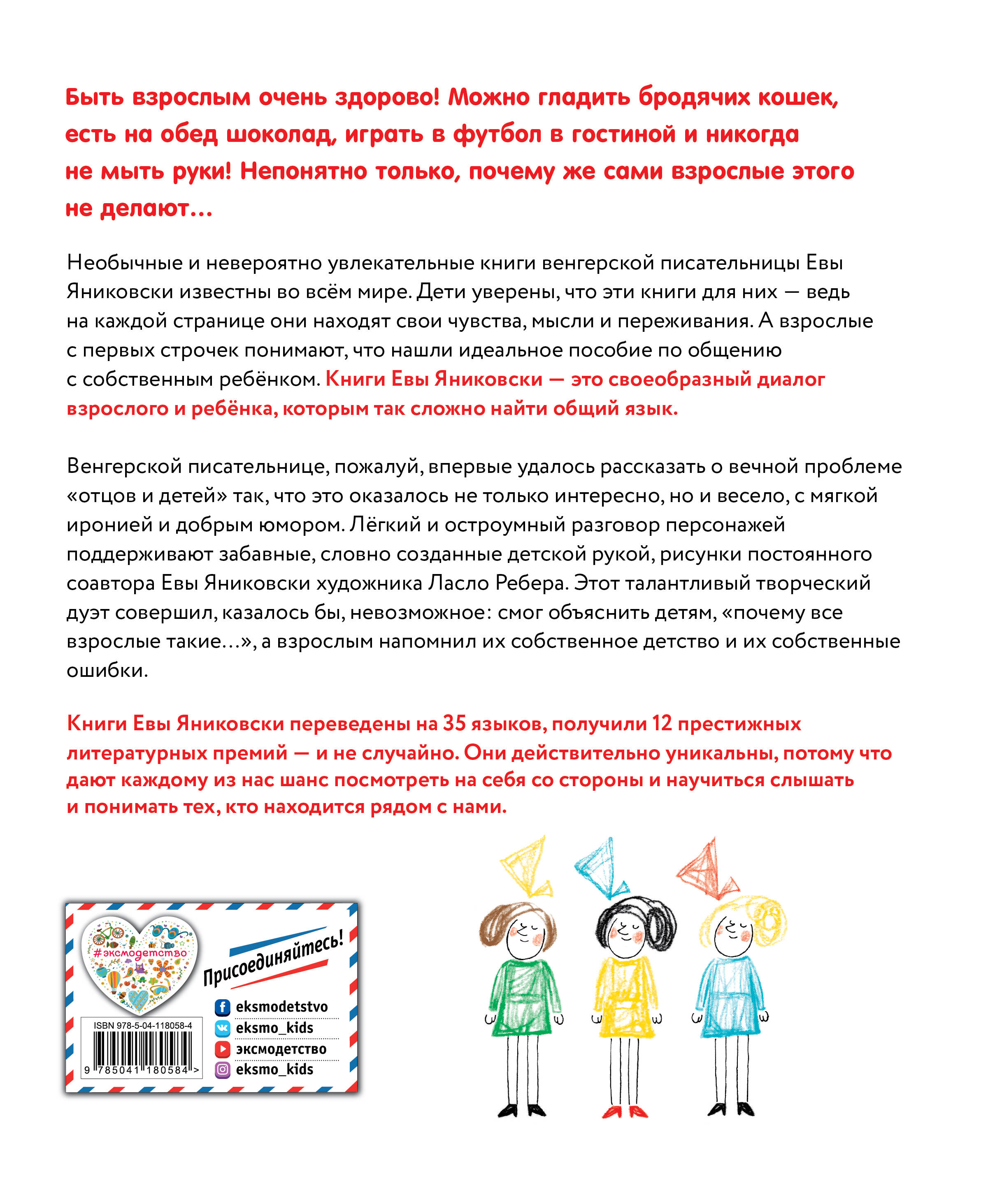 Книги венгерской писательницы Евы Яниковски, написанные от лица ребёнка и наполненные искрящимся юмором и лёгкой иронией, стали классикой детской литературы. Но их с большим удовольствием читают и взрослые, которым очень важно понять, чем живут и что чувствуют их дети. Главная особенность уникальных книг Евы Яниковски - это удивительная ёмкость и простота коротких текстов, которые с безупречной точностью раскрывают внутренний мир ребёнка. А кроме того, это своеобразный диалог на нестандартные темы между детьми и взрослыми, который помогает сократить разрыв между поколениями. Ева Яниковски окончила два университета: сначала в родном городе Сегеде, а затем - в Будапеште. Она изучала философию, этнографию, психологию, социологию и большую часть жизни посвятила работе с детьми и молодежью. Неудивительно, что её произведения переведены на тридцать пять языков и отмечены множеством престижнейших литературных премий и наград, в том числе Немецкой литературной молодежной премии. Писательница стала кавалером международного Ордена Улыбки, который присуждается известным людям, приносящим радость детям, а также была удостоена Офицерского креста ордена «За заслуги перед Венгерской Республикой». По мотивам её книг были поставлены детские спектакли, выпущено несколько мультфильмов. Неизменным иллюстратором книг Евы Яниковски был венгерский художник Ласло Ребер, лауреат Немецкой молодежной литературной премии и премии имени Г.-Х. Андерсена, а также обладатель многих других наград. Именно Л. Реберу удалось наиболее достоверно передать в своих работах внутренний мир ребёнка.| Издательство | ООО "Издательство "Эксмо" |