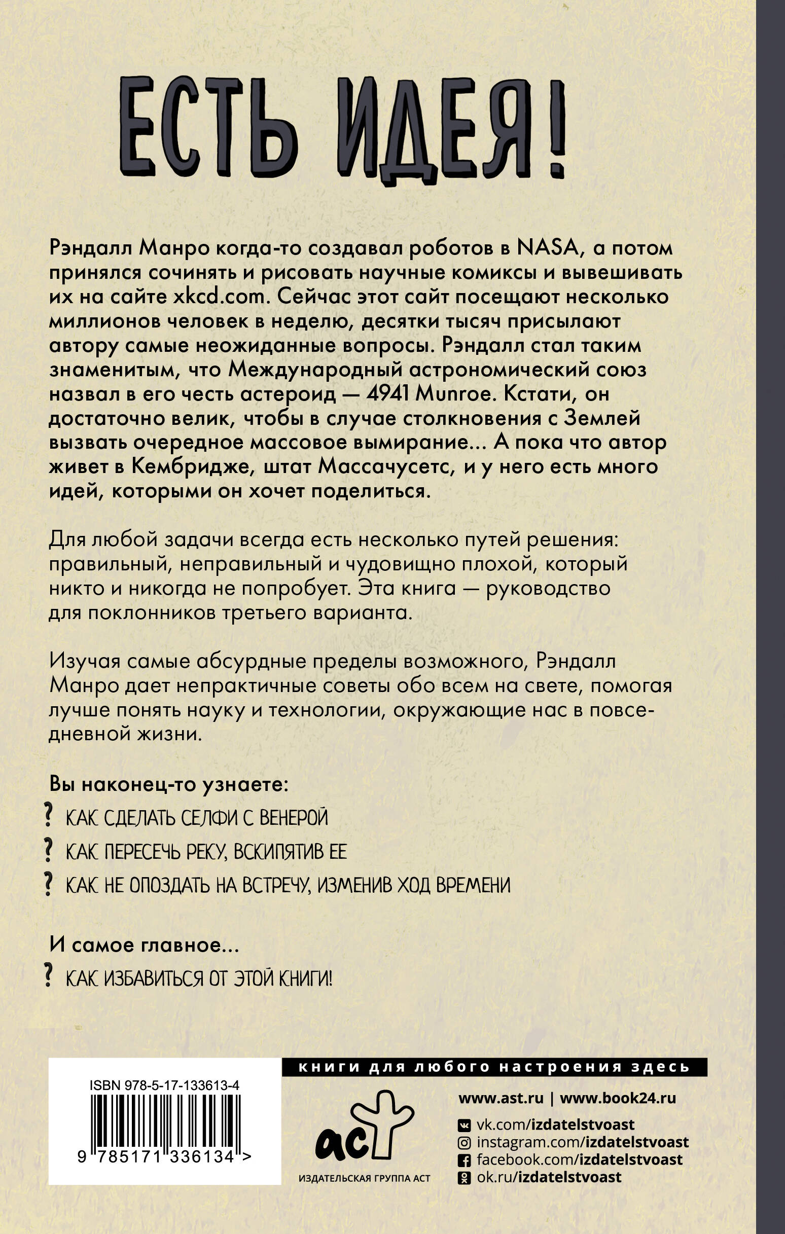 Для любой задачи всегда есть несколько путей решения: правильный, неправильный и чудовищно плохой, который никто и никогда не попробует. Эта книга - руководство для поклонников третьего варианта. Изучая самые абсурдные пределы возможного, Рэндалл Манро дает непрактичные советы обо всем на свете, помогая лучше понять науку и технологии, окружающие нас в повседневной жизни. Вы наконец-то узнаете: - Как сделать селфи с Венерой - Как пересечь реку, вскипятив ее - Как не опоздать на встречу, изменив ход времени И самое главное… - Как избавиться от этой книги!| Издательство | ИЗДАТЕЛЬСТВО "АСТ" |
