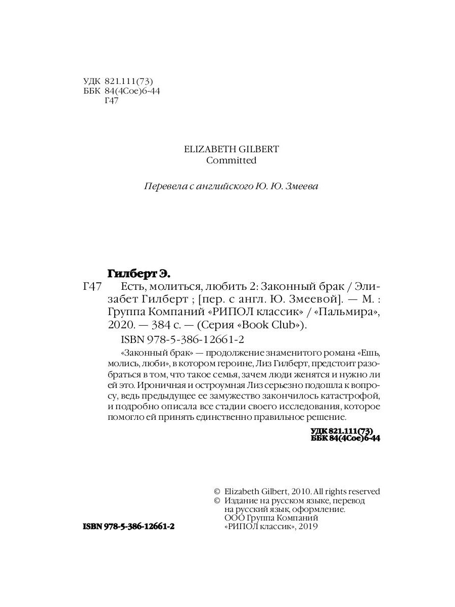 Аннотация: Есть, молиться, любить 2. Законный брак