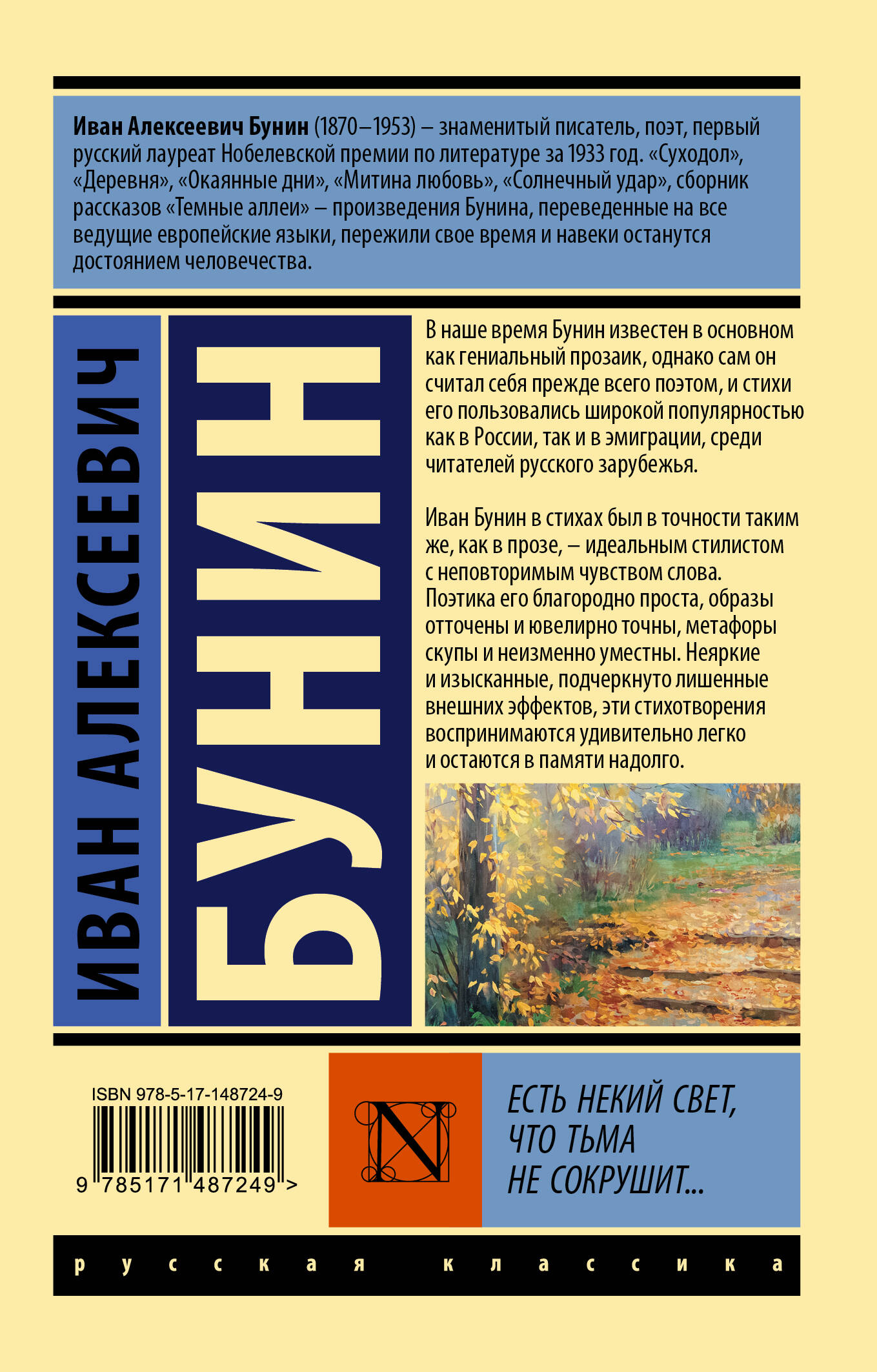 В наше время Бунин известен в основном как гениальный прозаик, однако сам он считал себя прежде всего поэтом, и стихи его пользовались широкой популярностью как в России, так и в эмиграции, среди читателей Русского зарубежья. Иван Бунин в стихах был в точности таким же, как в прозе, - идеальным стилистом с неповторимым чувством слова. Поэтика его благородно проста, образы отточены и ювелирно точны, метафоры скупы и неизменно уместны. Неяркие и изысканные, подчеркнуто лишенные внешних эффектов, эти стихотворения воспринимаются удивительно легко и остаются в памяти надолго.| Издательство | АСТ |