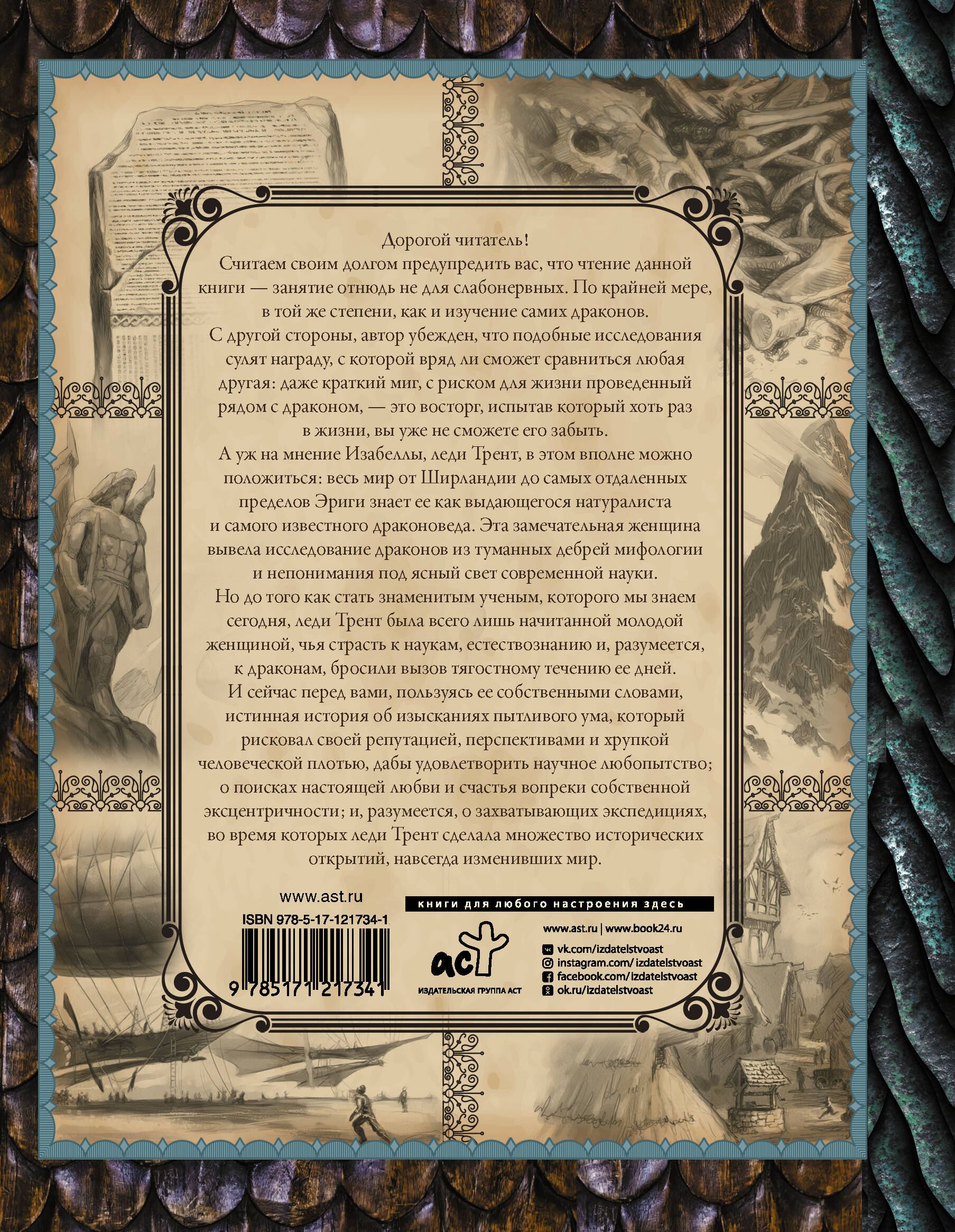 Дорогой читатель! Считаем своим долгом предупредить вас, что, чтение данной книги - занятие отнюдь не для слабонервных. По крайней мере, в той же степени, как и изучение самих драконов. С другой стороны, автор убежден, что подобные исследования сулят награду, с которой вряд ли сможет сравниться любая другая: даже краткий миг, с риском для жизни проведенный рядом с драконом, - это восторг, испытав который хоть раз в жизни, вы уже не сможете его забыть. А уж на мнение Изабеллы, леди Трент, в этом вполне можно положиться: весь мир от Ширландиии до самых отдаленных пределов Эриги знает ее как выдающегося натуралиста и самого известного драконоведа. Эта замечательная женщина вывела исследование драконов из туманных дебрей мифологии и непонимания и под ясный свет современной науки. Но до того как стать знаменитым ученым, которого мы знаем сегодня, леди Трент была всего лишь начитанной молодой женщиной, чья страсть к наукам, естествознанию и, разумеется, драконам, бросили вызов тягостному течению ее дней. И сейчас перед вами, пользуясь ее собственными словами, истинная история об изысканиях пытливого ума, который рисковал своей репутацией, перспективами и хрупкой человеческой плотью, дабы удовлетворить научное любопытство; о поисках настоящей любви и счастья вопреки собственной эксцентричности; и, разумеется, о захватывающих экспедициях, во время которых леди Трент сделала множество исторических открытий, навсегда изменивших мир.| Издательство | ИЗДАТЕЛЬСТВО "АСТ" |