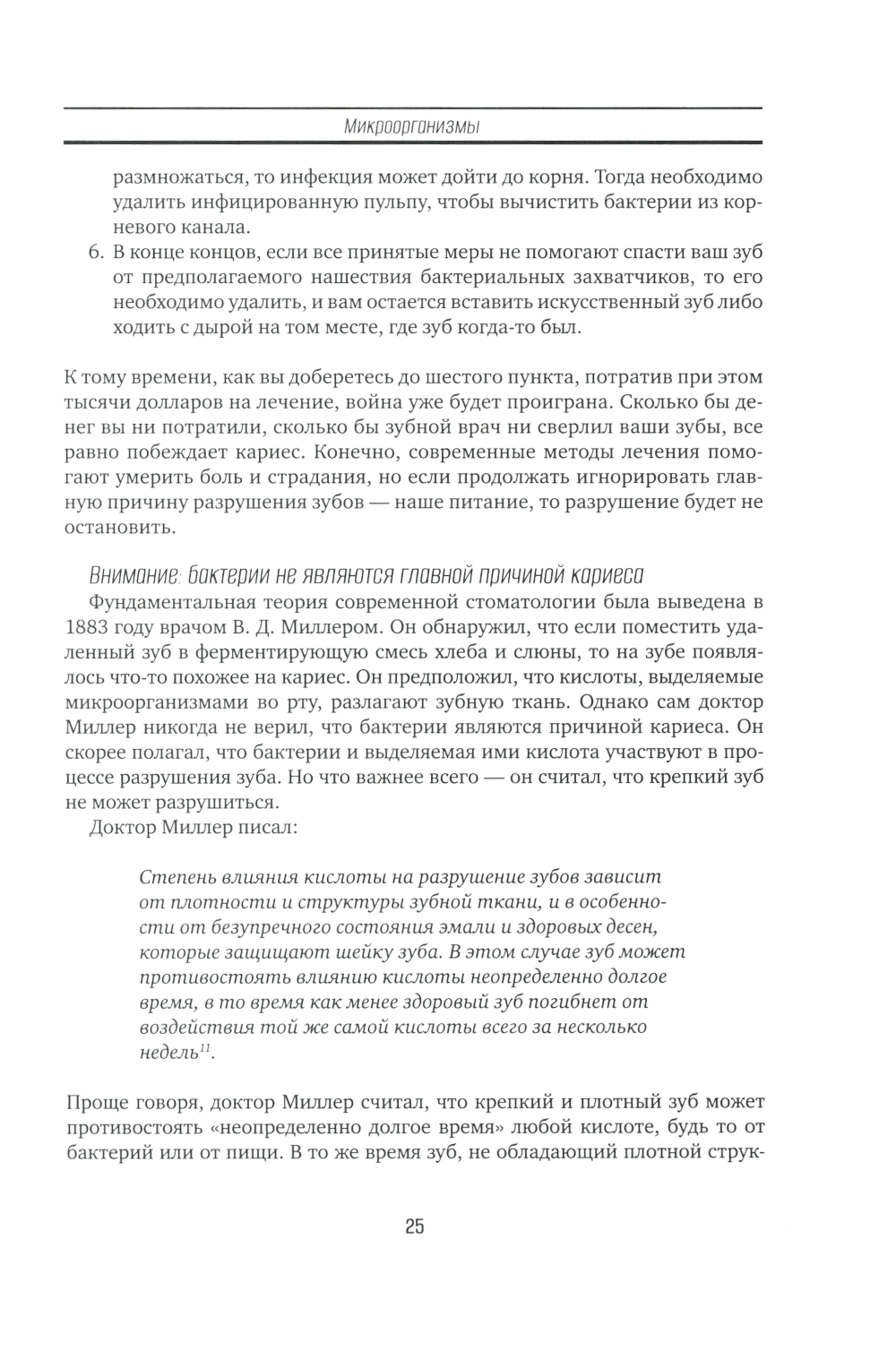 Из этой книги вы узнаете, что разрушение зубов не является результатом неудачной задумки природы, плохой наследственности или фактом старения, а происходит из-за неумения самого человека правильно выбирать продукты. Автор предлагает вашему вниманию несколько вариантов рациона, а также методы ухода за полостью рта, которые помогут оперативно остановить развитие кариеса, нарастить вторичный дентин, избежать или минимизировать истирание десен, вылечить и восстановить зубы после инфекции; избежать дорогостоящих и ненужных стоматологических процедур; улучшить общее состояние здоровья и повысить жизненный тонус организма.| Издательство | Ресурс |