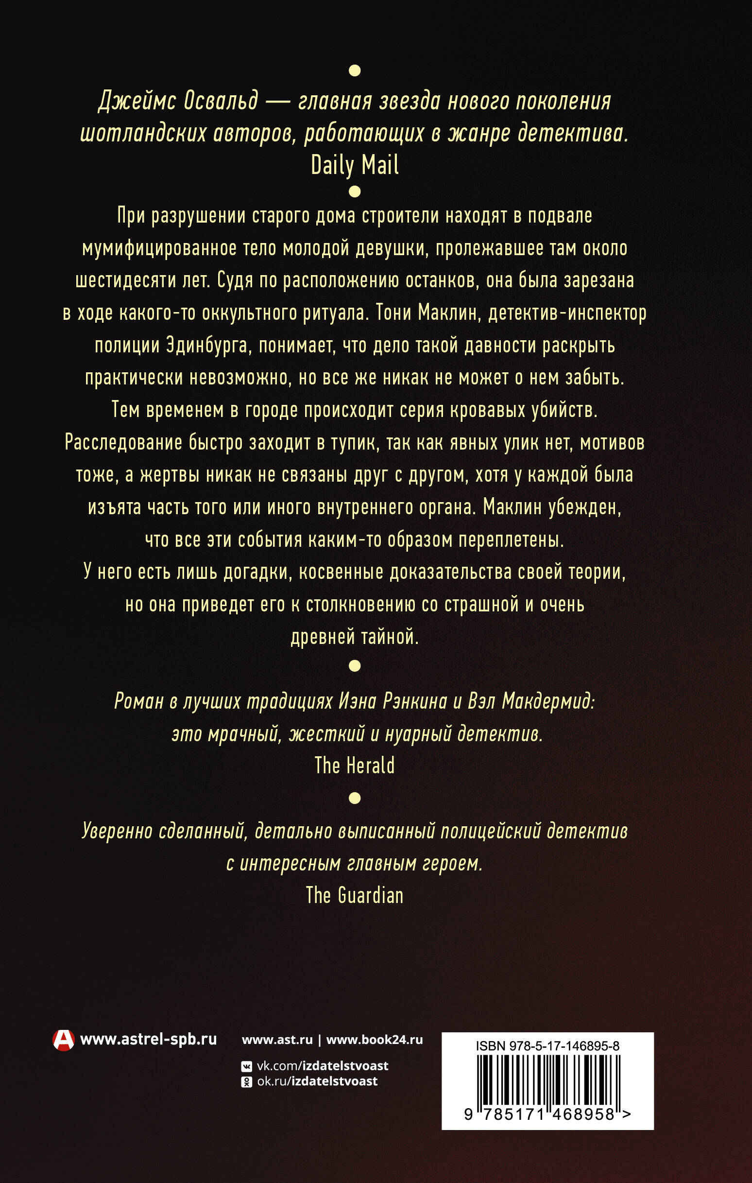При разрушении старого дома строители находят в подвале мумифицированное тело молодой девушки, пролежавшее там около шестидесяти лет. Судя по расположению останков, она была зарезана в ходе какого-то оккультного ритуала. Тони Маклин, детектив-инспектор полиции Эдинбурга, понимает, что дело такой давности раскрыть практически невозможно, но все же никак не может о нем забыть. Тем временем в городе происходит серия кровавых убийств. Расследование быстро заходит в тупик, так как явных улик нет, мотивов тоже, а жертвы никак не связаны друг с другом, хотя у каждой была изъята часть того или иного внутреннего органа. Маклин убежден, что все эти события каким-то образом переплетены. У него есть лишь догадки, косвенные доказательства своей теории, но она приведет его к столкновению со страшной и очень древней тайной.| Издательство | АСТ |