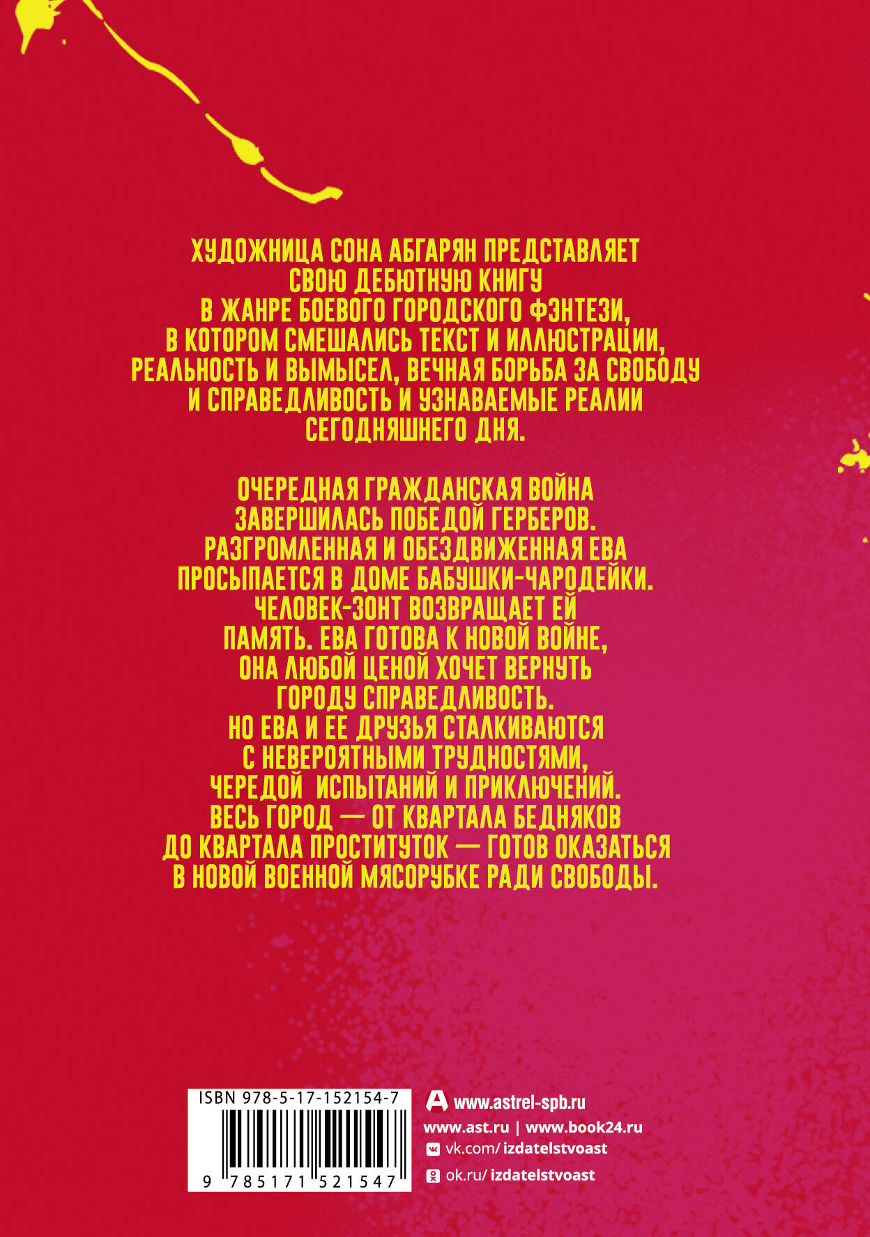 Художница Сона Абгарян представляет свою дебютную книгу в жанре боевого городского фэнтези, в котором смешались текст и иллюстрации, реальность и вымысел, вечная борьба за свободу и справедливость и узнаваемые реалии сегодняшнего дня. Очередная гражданская война завершилась победой Герберов. Разгромленная и обездвиженная Ева просыпается в доме Бабушки-чародейки. Человек-зонт возвращает ей память. Ева готова к новой войне, она любой ценой хочет вернуть городу справедливость. Но Ева и ее друзья сталкиваются с невероятными трудностями, чередой испытаний и приключений. Весь город - от квартала бедняков до квартала проституток - готов оказаться в новой военной мясорубке ради свободы.| Издательство | ИЗДАТЕЛЬСТВО "АСТ" |