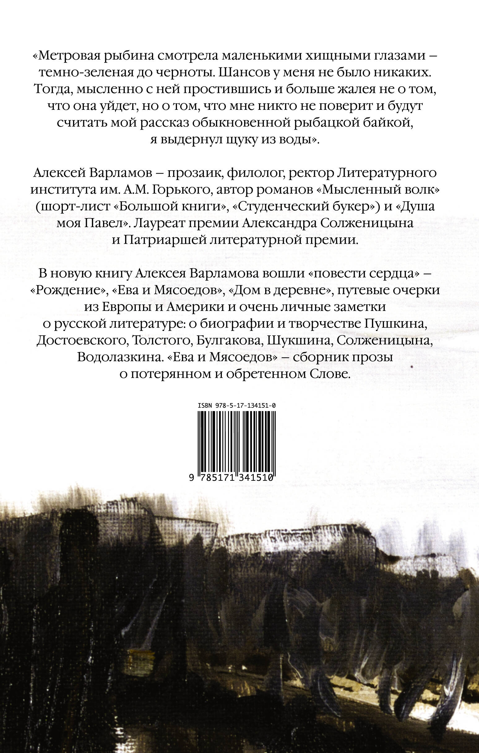 Полюбившиеся читателям тексты в новой редакции! Алексей Варламов - прозаик, филолог, ректор Литературного института им. А.М. Горького, автор романов "Мысленный волк" (короткий список "Большой книги", "Студенческий букер") и "Душа моя Павел". Лауреат премии Александра Солженицына и Патриаршей литературной премии. В новую книгу Алексея Варламова вошли "повести сердца" - "Рождение", "Ева и Мясоедов", "Дом в деревне", путевые очерки из Европы и Америки и очень личные заметки о русской литературе, о биографии и творчестве Пушкина, Достоевского, Толстого, Булгакова, Шукшина, Солженицына, Водолазкина. "Ева и Мясоедов" - сборник прозы о потерянном и обретенном Слове. "Метровая рыбина смотрела маленькими хищными глазами - темно-зеленая до черноты. Шансов у меня не было никаких. Тогда, мысленно с ней простившись и больше жалея не о том, что она уйдет, но о том, что мне никто не поверит и будут считать мой рассказ обыкновенной рыбацкой байкой, я выдернул щуку из воды".| Издательство | ИЗДАТЕЛЬСТВО "АСТ" |