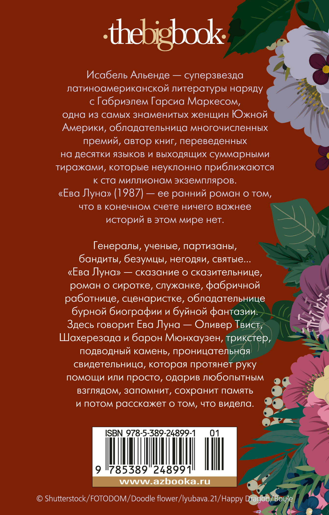 Исабель Альенде - суперзвезда латиноамериканской литературы наряду с Габриэлем Гарсиа Маркесом, одна из самых знаменитых женщин Южной Америки, обладательница многочисленных премий, автор книг, переведенных на десятки языков и выходящих суммарными тиражами, которые неуклонно приближаются к ста миллионам экземпляров. "Ева Луна" (1987) - ее ранний роман о том, что в конечном счете ничего важнее историй в этом мире нет. Генералы, ученые, партизаны, бандиты, хозяйка борделя, безумцы, негодяи, святые... "Ева Луна" - сказание о сказительнице, роман о сиротке, служанке, фабричной работнице, сценаристке, обладательнице бурной биографии и буйной фантазии. Здесь говорит Ева Луна - Оливер Твист, Шахерезада и барон Мюнхаузен, трикстер, подводный камень, проницательная свидетельница, которая протянет руку помощи или просто, одарив любопытным взглядом, запомнит, сохранит память и потом расскажет о том, что видела.| Издательство | Азбука-Аттикус Издат.группа ООО |