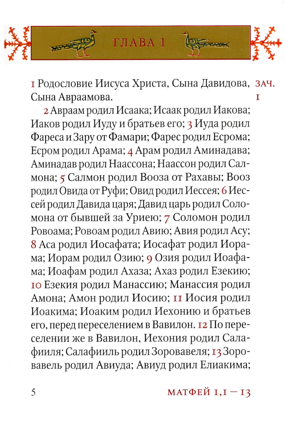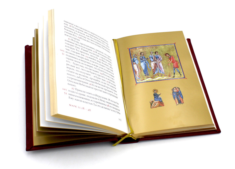Настоящее издание Евангелия предваряется изображениями двунадесятых праздников и некоторых Евангельских событий из земной жизни Господа Иисуса Христа и сопровождается текстами соответствующих ветхозаветных пророчеств. Эта идея заимствована из Россанского Евангелия - древнейшего иллюстрированного Четвероевангелия VI века. В конце книги помещены указания пророчеств Ветхого Завета, совершившихся в Новом Завете. Подарочное, богато иллюстрированное издание станет замечательным подарком для любого верующего человека.| Издательство | Изд.Московской Патриархии РПЦ |