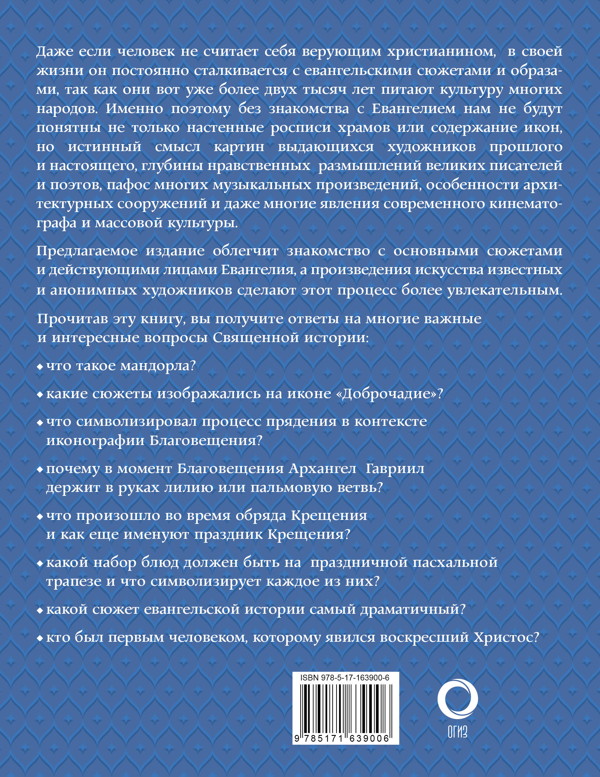 Даже если человек не считает себя верующим христианином, в своей жизни он постоянно сталкивается с евангельскими сюжетами и образами, так как они вот уже более двух тысяч лет питают культуру многих народов. Именно поэтому без знакомства с Евангелием нам не будут понятны не только настенные росписи храмов или содержание икон, но истинный смысл картин выдающихся художников прошлого и настоящего, глубины нравственных размышлений великих писателей и поэтов, пафос многих музыкальных произведений, особенности архитектурных сооружений и даже многие явления современного кинематографа и массовой культуры. Предлагаемое издание облегчит знакомство с основными сюжетами и действующими лицами Евангелия, а произведения искусства известных и анонимных художников сделают этот процесс более интересным. Приступая к работе над евангельским сюжетом, художник стремится не только предать общий смысл происходящего, но подчеркнуть, выделить ту мысль, которая ему представляется наиболее важной, существенной. Художник может сделать это прямо, непосредственно, а может выразить свою мысль в завуалированной форме. Для этого существует широкий спектр художественных приемов: используя особенности композиции и колорита, символы и аллегории можно привнести в произведение искусства дополнительные смыслы, направить мысль пытливого зрителя в нужную сторону. Расположение материала в хронологической последовательности, а также необходимые комментарии и пояснения позволят составить целостную картину евангельской истории, получить информацию о ее главных действующих лицах. • Прочитав эту книгу, вы получите ответы на многие важные и интересные вопросы Священной истории: • Что такое мандорла? • Какие сюжеты изображались на иконе "Доброчадие"? • Что символизировал процесс прядения в контексте иконографии Благовещения? • Почему в момент Благовещения Архангел Гавриил держит в руках лилию или пальмовую ветвь? • Что произошло во время обряда Крещения и как еще именуют праздник Крещения? • Символом чего стали Золотые врата, через которые произошел Вход Спасителя в Иерусалим? • Какое набор блюд должен быть на праздничной пасхальной трапезе и что символизирует каждое из них? • Какой сюжет евангельской истории самый драматичный? • Кто был первым человеком, которому явился воскресший Христос? Об авторе: Бицадзе Наталья Витальевна, профессор кафедры искусствоведения Академии И. Глазунова, преподаватель РГГУ, Кандидат исторических наук.Закончила исторический факультет МГУ, аспирантуру МГУ. Основные места работы: профессор Российской академии живописи, ваяния и зодчества Ильи Глазунова. Государственный исторический музей, Российский институт культурологии, Российский Государственный Гуманитарный Университет, Российский государственный социальный университет. Сфера профессиональных интересов: древнерусское искусство; искусство эпохи модерна; история и культура древних славян; психология искусства; история религии; история мировой культуры; отечественная история; проблемы сохранения и пропаганды культурного наследия, включение его в актуальную культуру. Темы лекций: иконография православной иконы, иконографияпраздников, иконописные школы.| Издательство | Издательство "АСТ" |