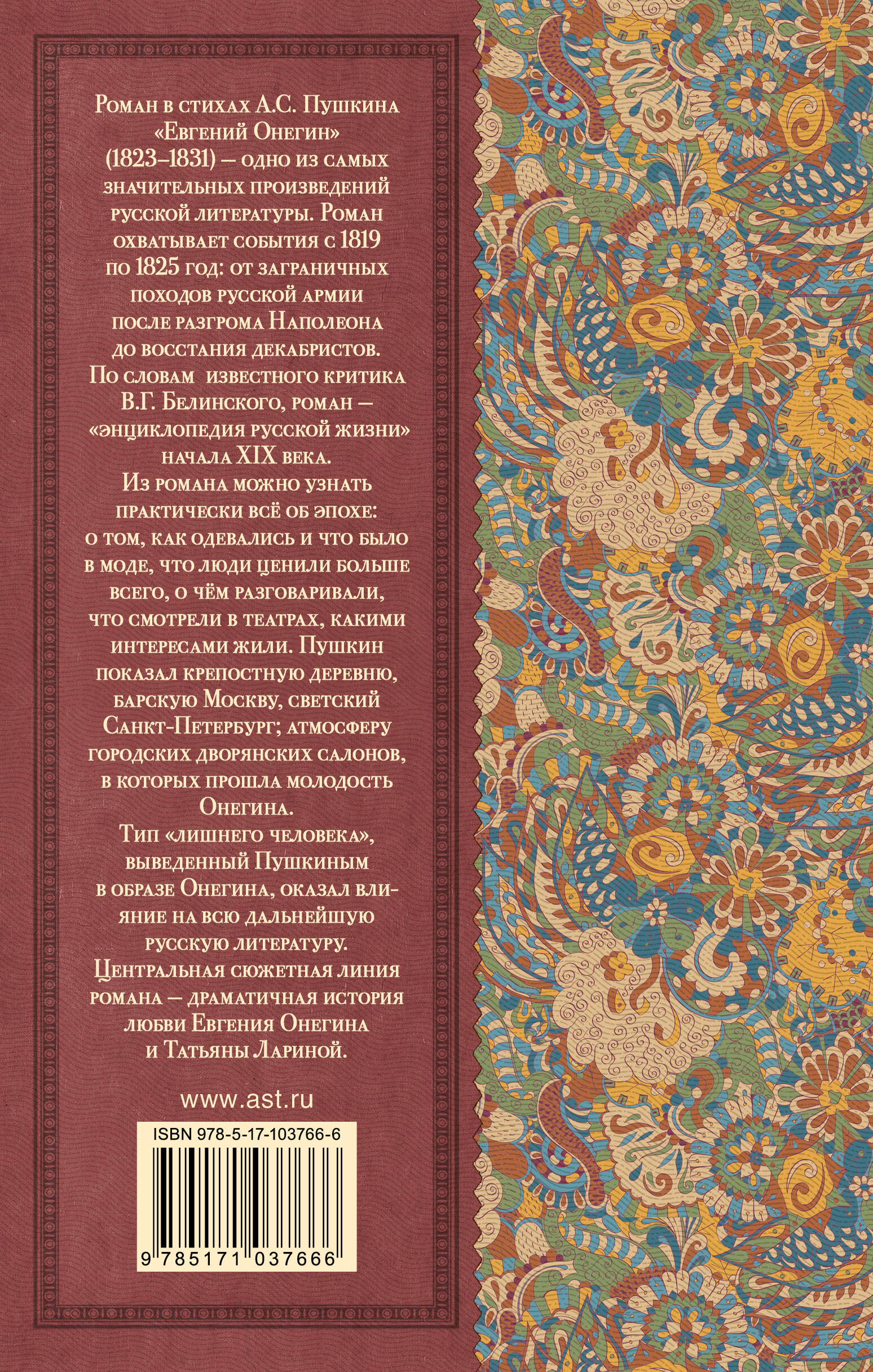 Роман в стихах А.С. Пушкина «Евгений Онегин» (1823 - 1831) - одно из самых значительных произведений русской литературы. Роман охватывает события с 1819 по 1825 год: от заграничных походов русской армии после разгрома Наполеона до восстания декабристов. По словам известного критика В.Г. Белинского, роман - «энциклопедия русской жизни» начала XIX века. Из романа можно узнать практически всё об эпохе: о том, как одевались и что было в моде, что люди ценили больше всего, о чём разговаривали, что смотрели в театрах, какими интересами жили. Пушкин показал крепостную деревню, барскую Москву, светский Санкт-Петербург; атмосферу городских дворянских салонов, в которых прошла молодость Онегина.| Издательство | ИЗДАТЕЛЬСТВО "АСТ" |