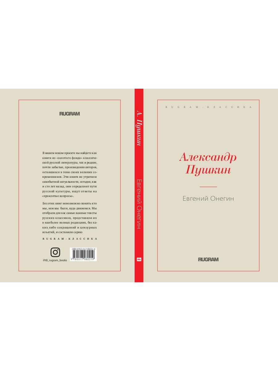 В нашем новом проекте вы найдете как книги из «золотого фонда» классической русской литературы, так и редкие, почти забытые, произведения авторов, оставшихся в тени своих великих современников. Эти книги не утратили самобытной актуальности, сегодня, как и сто лет назад, они определяют пути русской культуры, ищут ответы на «проклятые вопросы». Без этих книг невозможно понять кто мы, кем мы были, куда движемся. Мы отобрали для вас самые важные тексты русских классиков, представили их в наиболее полных редакциях, без каких либо сокращений и цензурных изъятий, и составили серию RUGRAM-КЛАССИКА. Вашему вниманию представляется книга Александра Пушкина «Евгений Онегин».| Издательство | Т8 RUGRAM |