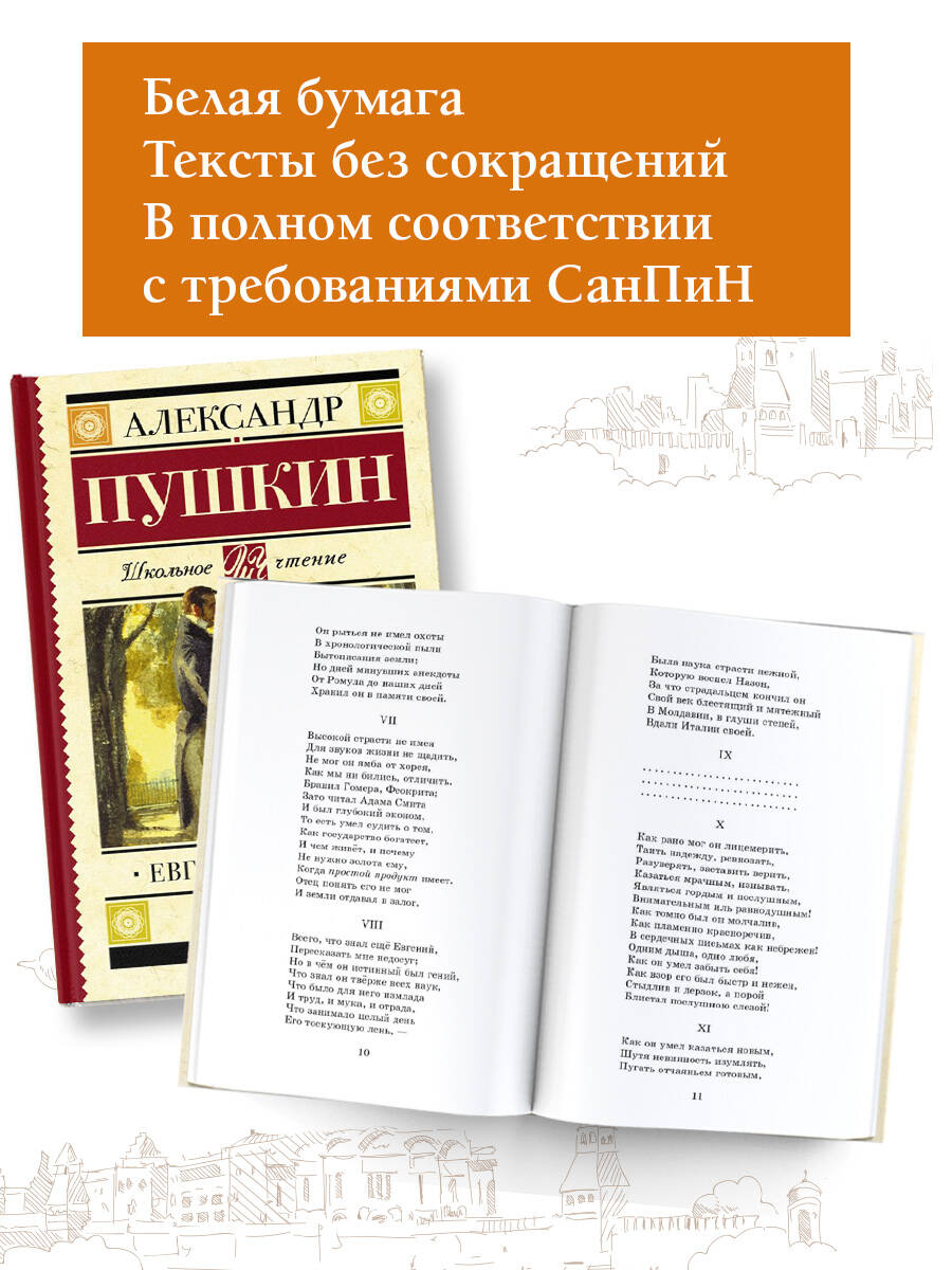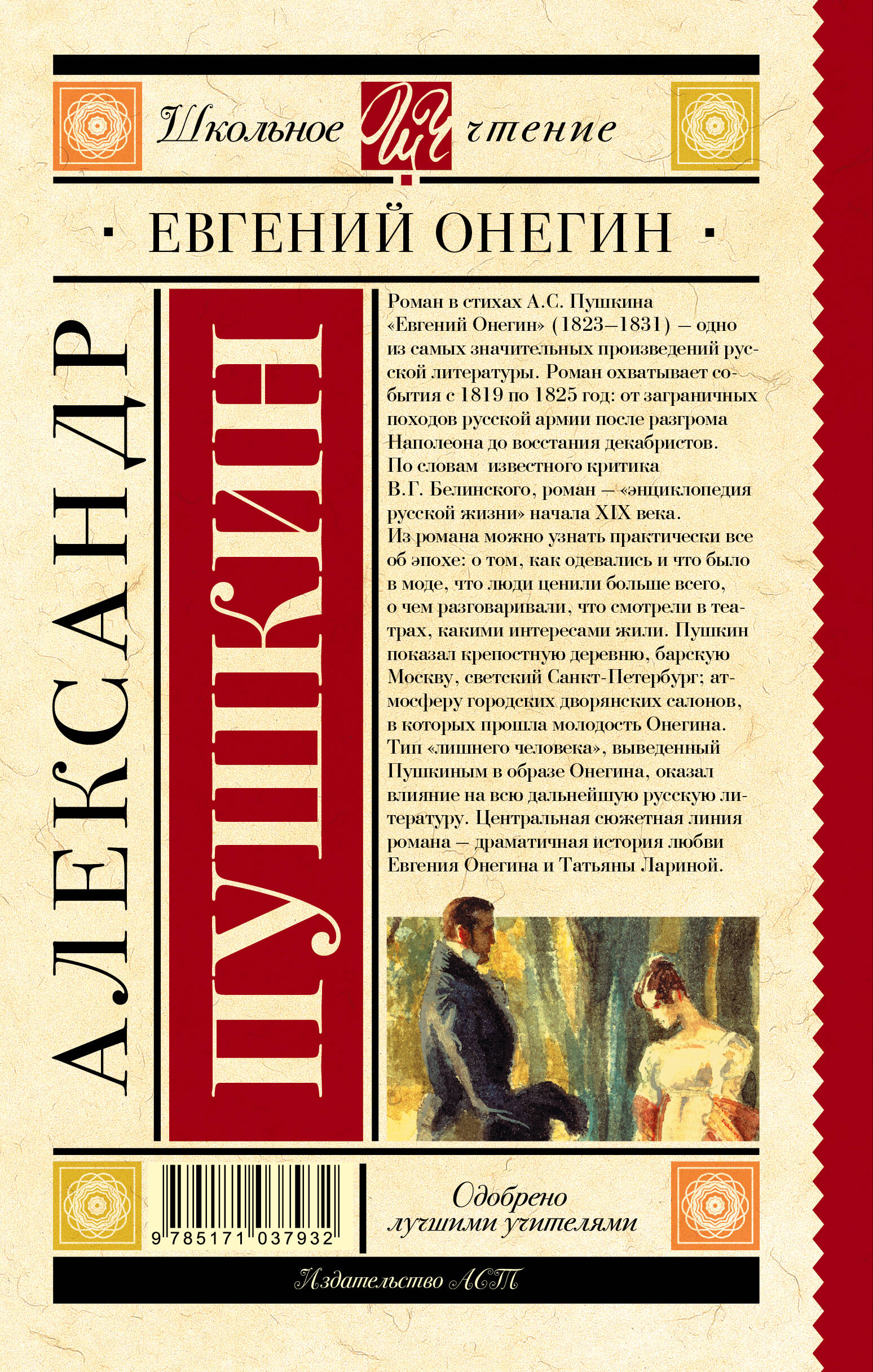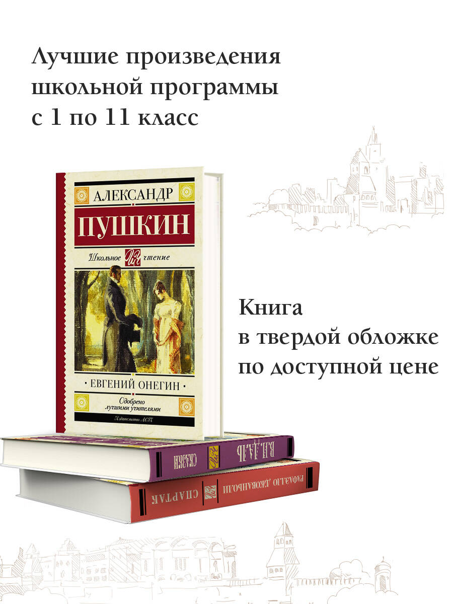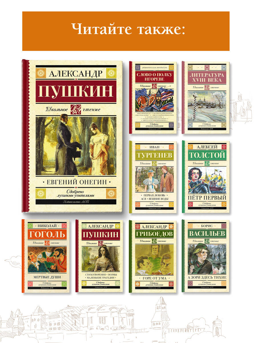 Роман в стихах А.С. Пушкина «Евгений Онегин» (1823 - 1831) - одно из самых значительных произведений русской литературы. Роман охватывает события с 1819 по 1825 год: от заграничных походов русской армии после разгрома Наполеона до восстания декабристов. По словам известного критика В.Г. Белинского, роман - «энциклопедия русской жизни» начала XIX века. Из романа можно узнать практически всё об эпохе: о том, как одевались и что было в моде, что люди ценили больше всего, о чём разговаривали, что смотрели в театрах, какими интересами жили. Пушкин показал крепостную деревню, барскую Москву, светский Санкт-Петербург; атмосферу городских дворянских салонов, в которых прошла молодость Онегина.| Издательство | ИЗДАТЕЛЬСТВО "АСТ" |