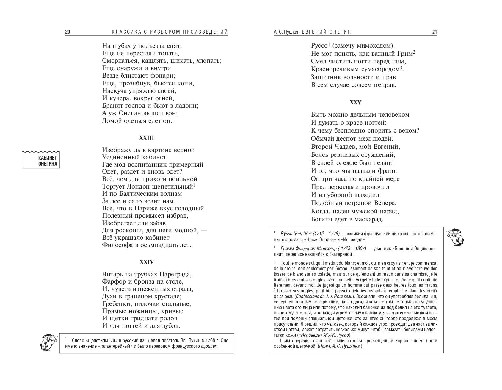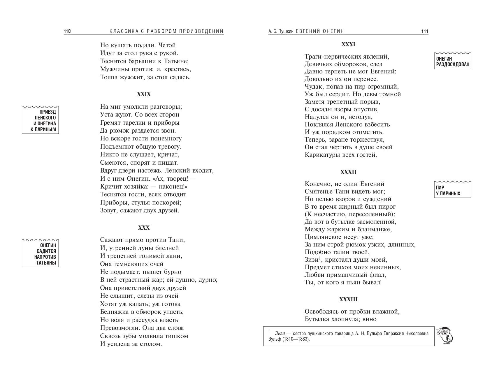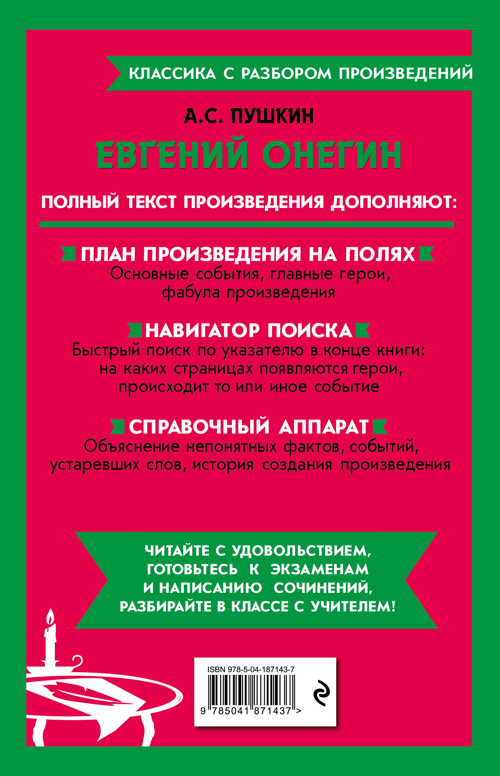 «Евгений Онегин» - бессмертное произведение прославленного русского поэта и прозаика А. С. Пушкина, написанное в начале XIX века. Этот уникальный роман в стихах, в котором поэт с великолепной точностью использовал все богатство и многообразие русского языка, до сих пор пользуется большой популярностью как среди школьников, так и среди старших поколений. Новое издание романа в невероятном оформлении с голографической фольгой на обложке станет не только незаменимым помощником в подготовке к ЕГЭ, ОГЭ, урокам литературы, но и приятным подарком для всех ценителей классической литературы. В нем вы найдете уникальные справочные материалы: заметки на полях для быстрого поиска нужного фрагмента, развернутые комментарии, где объясняются устаревшие слова и непонятные факты, историю создания произведения, указатель имен и событий. Все это поможет не только быстро и легко подготовиться к экзаменам, но и узнать новые факты, которые можно было упустить в школе. Произведение описывает любовь и жизнь русской знати начала XIX века, в центре которого Евгений Онегин - молодой скучающий аристократ из Петербурга. Роман затрагивает отношения героя с друзьями и обществом, а также повествует о непростой, полной противоречий и душевных терзаний любви. По праву нареченный «энциклопедией русской жизни», роман охватывает ряд важных идей и проблем того времени, таких как противоречия между старыми и новыми взглядами на жизнь, общественными и личными интересами, нравственностью и эгоизмом. Собрание всех книг серии «Классика с разбором произведений» в стильных обложках станет невероятным украшением домашней библиотеки. Ее яркое оформление можно будет заслуженно назвать жемчужиной вашей коллекции.| Издательство | ООО "Издательство "Эксмо" |