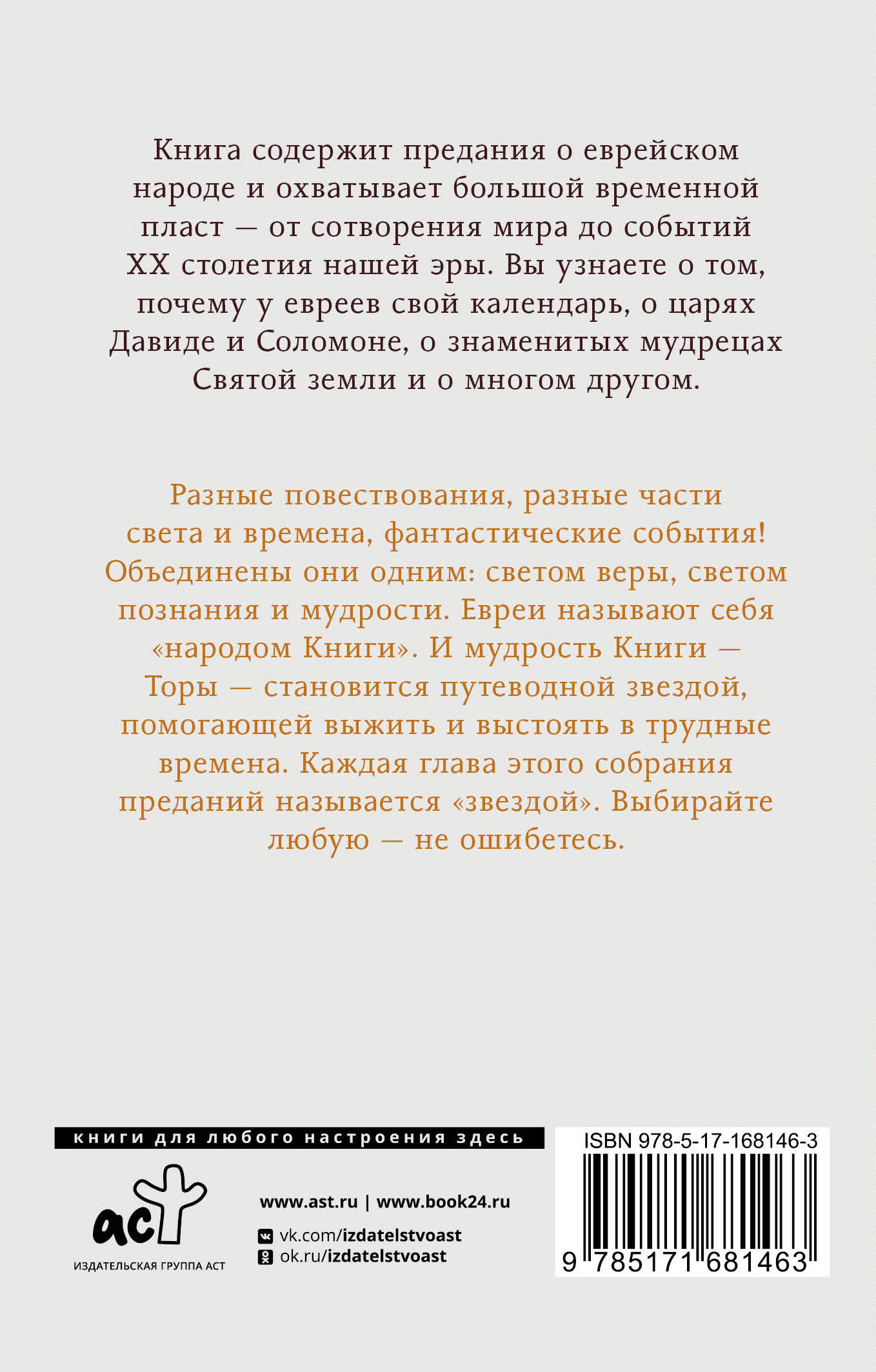 Книга содержит предания о еврейском народе и охватывает большой временной пласт - от сотворения мира до событий XX столетии нашей эры. Вы узнаете о том, почему у евреев свой календарь, о царях Давиде и Соломоне, о знаменитых мудрецах Святой земли и о многом другом. Разные повествования, разные части света и времена, фантастические события! Объединены они одним: светом веры, светом познания и мудрости. Евреи называют себя "народом Книги". И мудрость Книги - Торы - становится путеводной звездой, помогающей выжить и выстоять в трудные времена. Каждая глава этого собрания преданий называется "звездой". Выбирайте любую - не ошибетесь.| Издательство | Издательство "АСТ" |