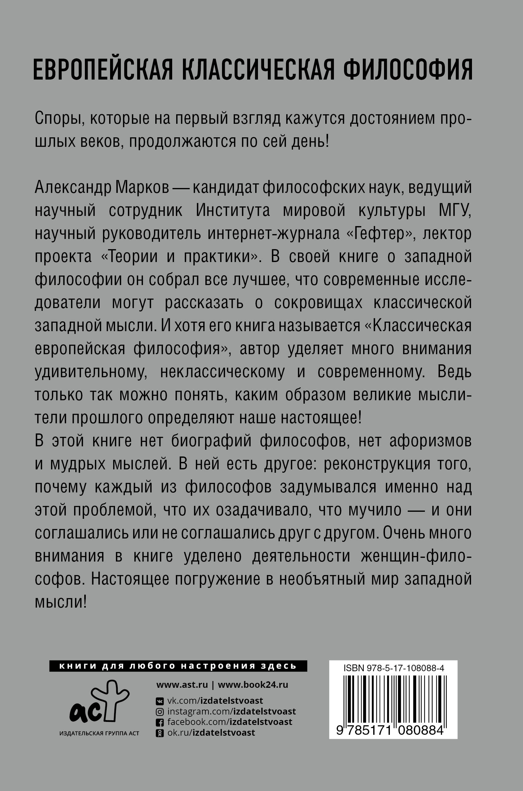 Споры, которые на первый взгляд кажутся достоянием прошлых веков, продолжаются по сей день! Александр Марков - кандидат философских наук, ведущий научный сотрудник Института мировой культуры МГУ, научный руководитель интернет-журнала «Гефтер», лектор проекта «Теории и практики». В своей книге о западной философии он собрал все лучшее, что современные исследователи могут рассказать о сокровищах классической западной мысли. И хотя его книга называется «Классическая европейская философия», автор уделяет много внимания удивительному, неклассическому и современному. Ведь только так можно понять, каким образом великие мыслители прошлого определяют наше настоящее! В этой книге нет биографий философов, нет афоризмов и мудрых мыслей. В ней есть другое: реконструкция того, почему каждый из философов задумывался именно над этой проблемой, что их озадачивало, что мучило - и они соглашались или не соглашались друг с другом. Очень много внимания в книге уделено деятельности женщин-философов. Настоящее погружение в необъятный мир западной мысли!| Издательство | ИЗДАТЕЛЬСТВО "АСТ" |