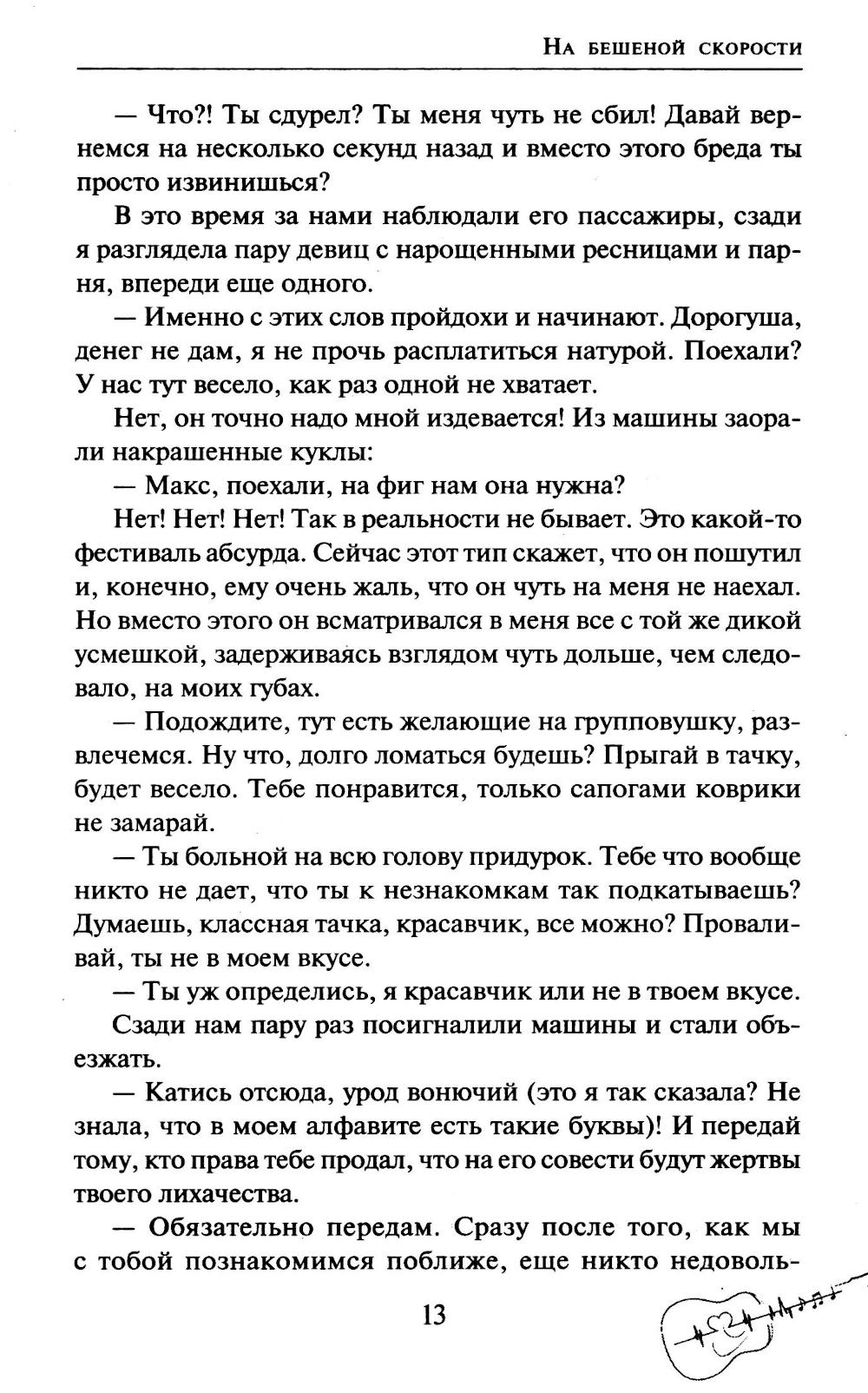 СОДЕРЖИТ ИНФОРМАЦИЮ О НАРКОТИЧЕСКИХ ИЛИ ПСИХОТРОПНЫХ ВЕЩЕСТВАХ, УПОТРЕБЛЕНИЕ КОТОРЫХ ОПАСНО ДЛЯ ЗДОРОВЬЯ. ИХ НЕЗАКОННЫЙ ОБОРОТ ВЛЕЧЕТ УГОЛОВНУЮ ОТВЕТСТВЕННОСТЬ. Остросюжетный любовный роман «На бешеной скорости» от современной писательницы Тамуны Менро, которая с первых строчек вовлекает читателей в сюжет и дарит бурю ярких эмоций. Я жила в идеальной семье, встречалась с идеальным парнем и училась в выпускном классе. Пока однажды моей семье не пришлось переехать в другой город. Отец устроил меня в элитную школу, где правят деньги и прихоти ее учеников. Особенно их, местных Хищников, которые объявили охоту на мое тело. Им плевать на мои отказы и на то, что у меня есть парень. Я сопротивлялась... Но он, самый жестокий и бесчувственный Хищник, решил забрать меня себе. Он ворвался в мою жизнь неконтролируемым пожаром и сжег все привычное дотла, затмив мой разум, лишив меня дома, семьи и представлений о счастливом будущем. Но последнее слово в этой битве любви, ненависти и предательства я оставила за собой. Мой монолог будет преследовать его всю оставшуюся жизнь.| Издательство | Яуза-каталог |