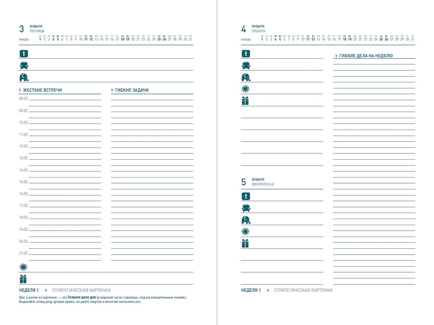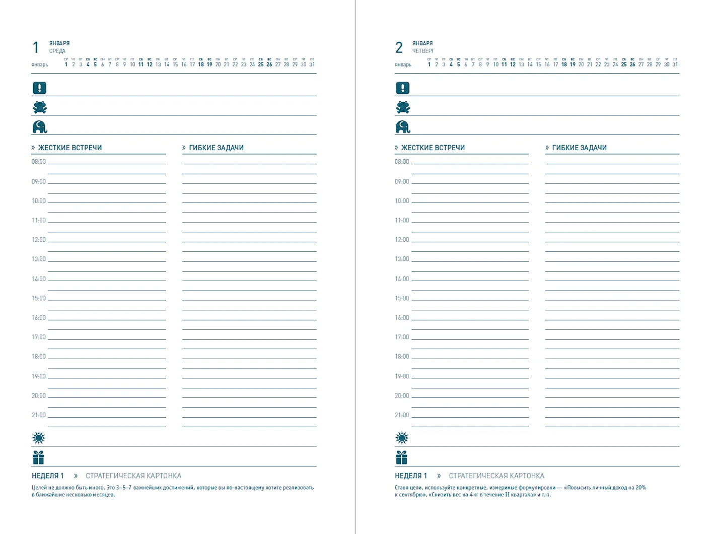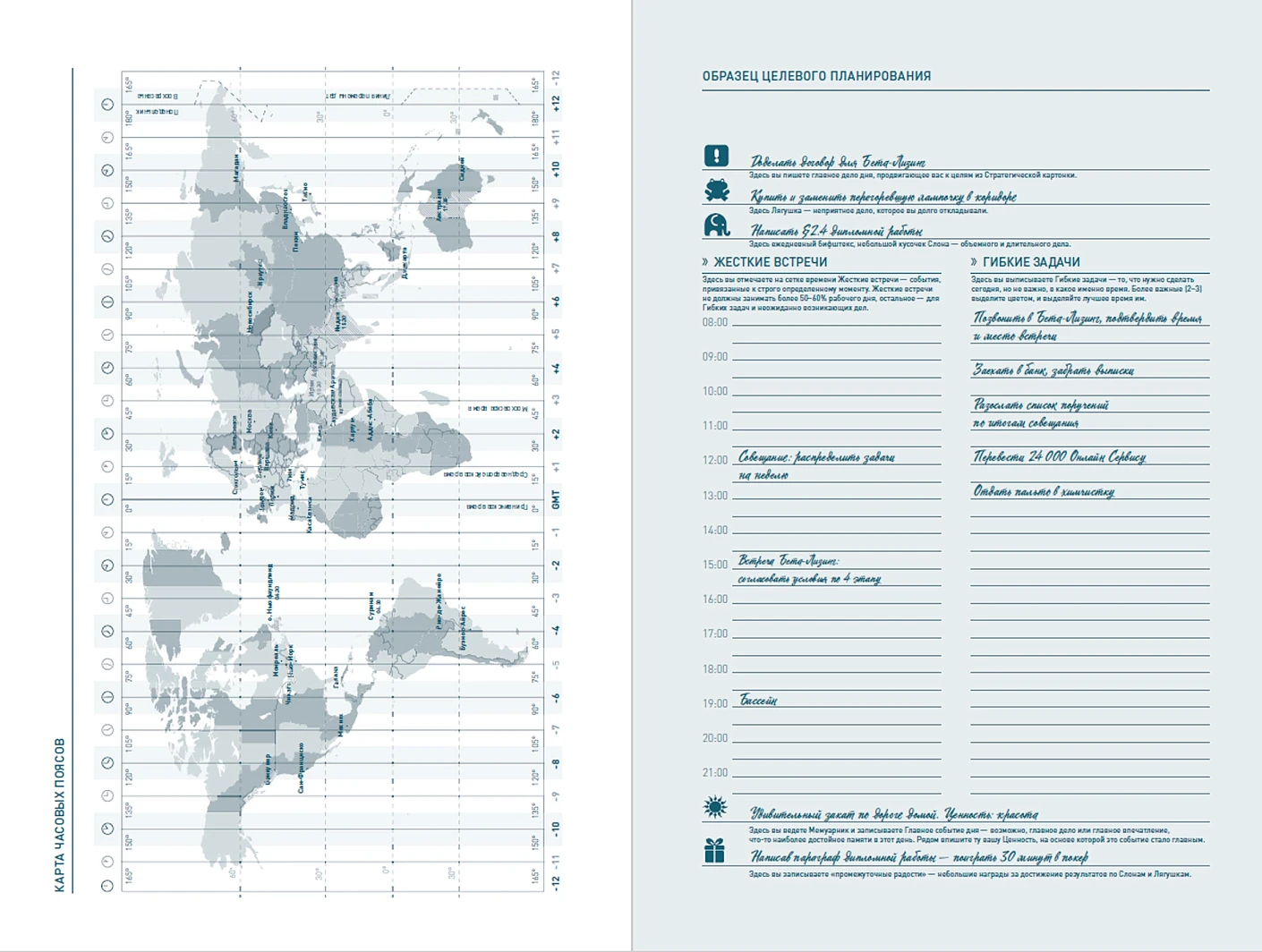 - В ежедневник «встроены» инструменты, которые приучат вас не забывать об ориентирах, быстро расправляться с задачами, которые вы бесконечно откладывали, и справляться с объемными делами, разбивая их на мелкие.