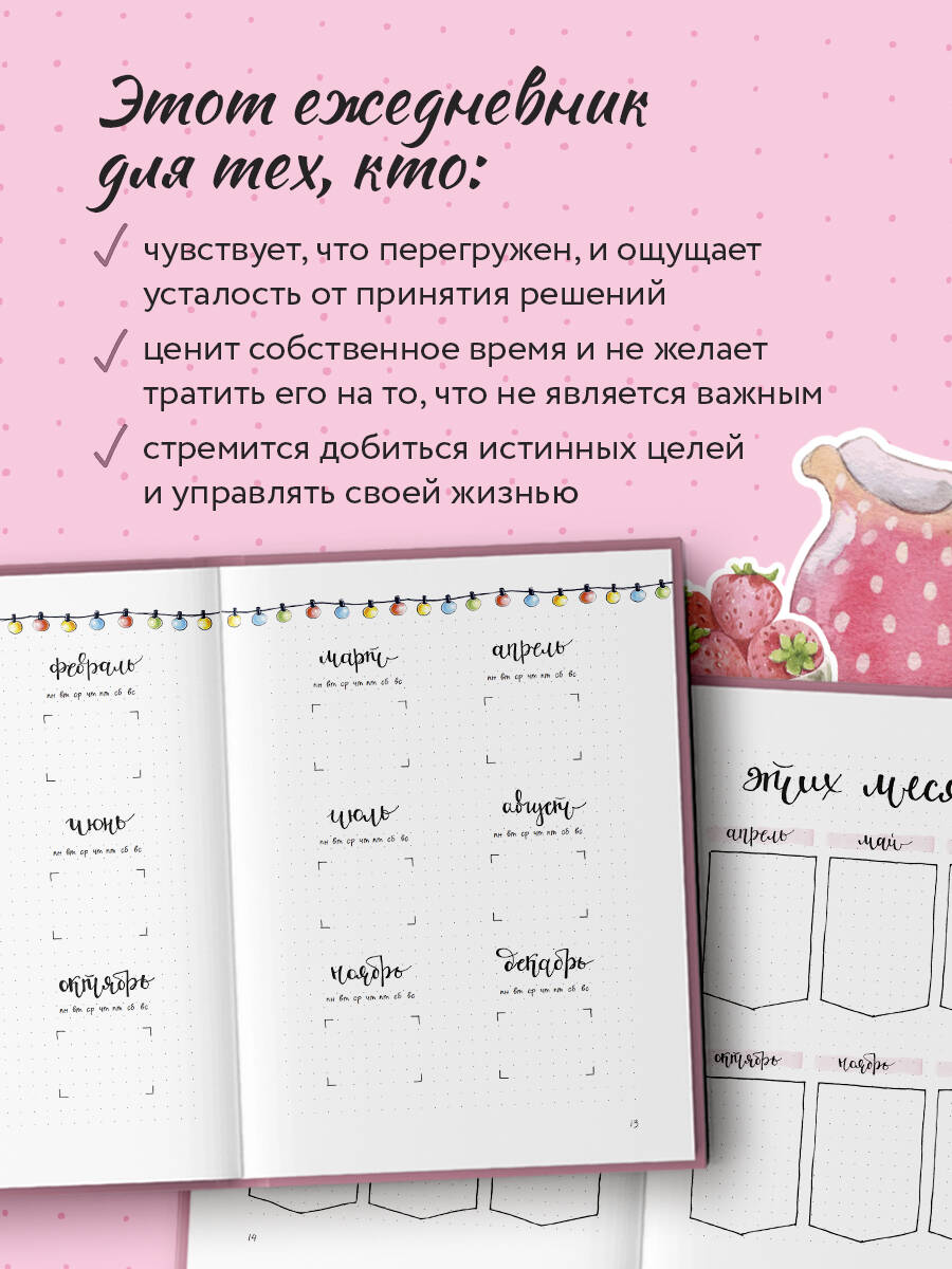 Научитесь планировать свое время и действия вместе с популярной художницей и многодетной мамой по совместительству. Время можно только потратить. Его невозможно создать или восполнить. Поэтому так важно, как мы им распоряжаемся. Система Bullet Journal позволяет отследить, куда утекают драгоценные минуты, и потратить их на то, что действительно важно. Внутри вы найдете множество полезных разделов: планы на год и на месяц, таблицы доходов и расходов, самые разнообразные списки, wishlist, а также множество свободного места для собственного творчества. ЭТОТ ЕЖЕДНЕВНИК ДЛЯ ДЛЯ ТЕХ, КТО: · чувствует, что перегружен, и ощущает усталость от принятия решений; · каждый день сталкивается с огромным количеством задач; · ценит собственное время и не желает тратить его на то, что не является важным; · хочет повысить свою эффективность; · стремится добиться истинных целей и управлять своей жизнью.| Издательство | Эксмо |