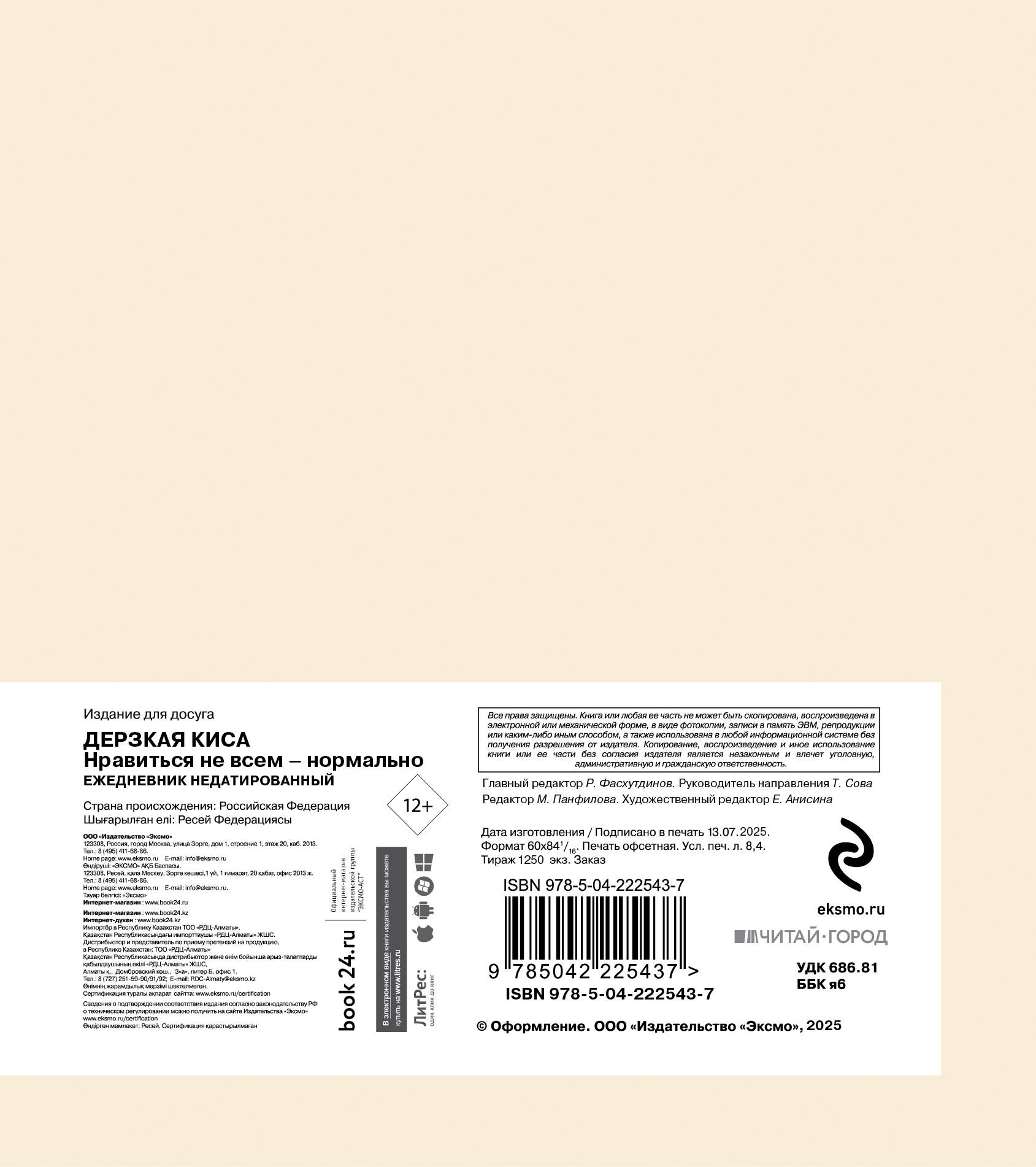 Ежедневник для каждой дерзкой кисы, которая не боится показать коготки и свой характер! Удобный компактный формат позволит брать ежедневник куда угодно, а благодаря яркому оформлению вы точно захотите его заполнять каждый день! Записывайте все свои планы, выгружайте из мозга лишние мысли на специальных страничках. А кому вы не нравитесь, тот просто завидует! Что внутри: - Разлинованные листы для записей. - Разделы для списка дел и заметок.| Издательство | ООО "Издательство "Эксмо" |