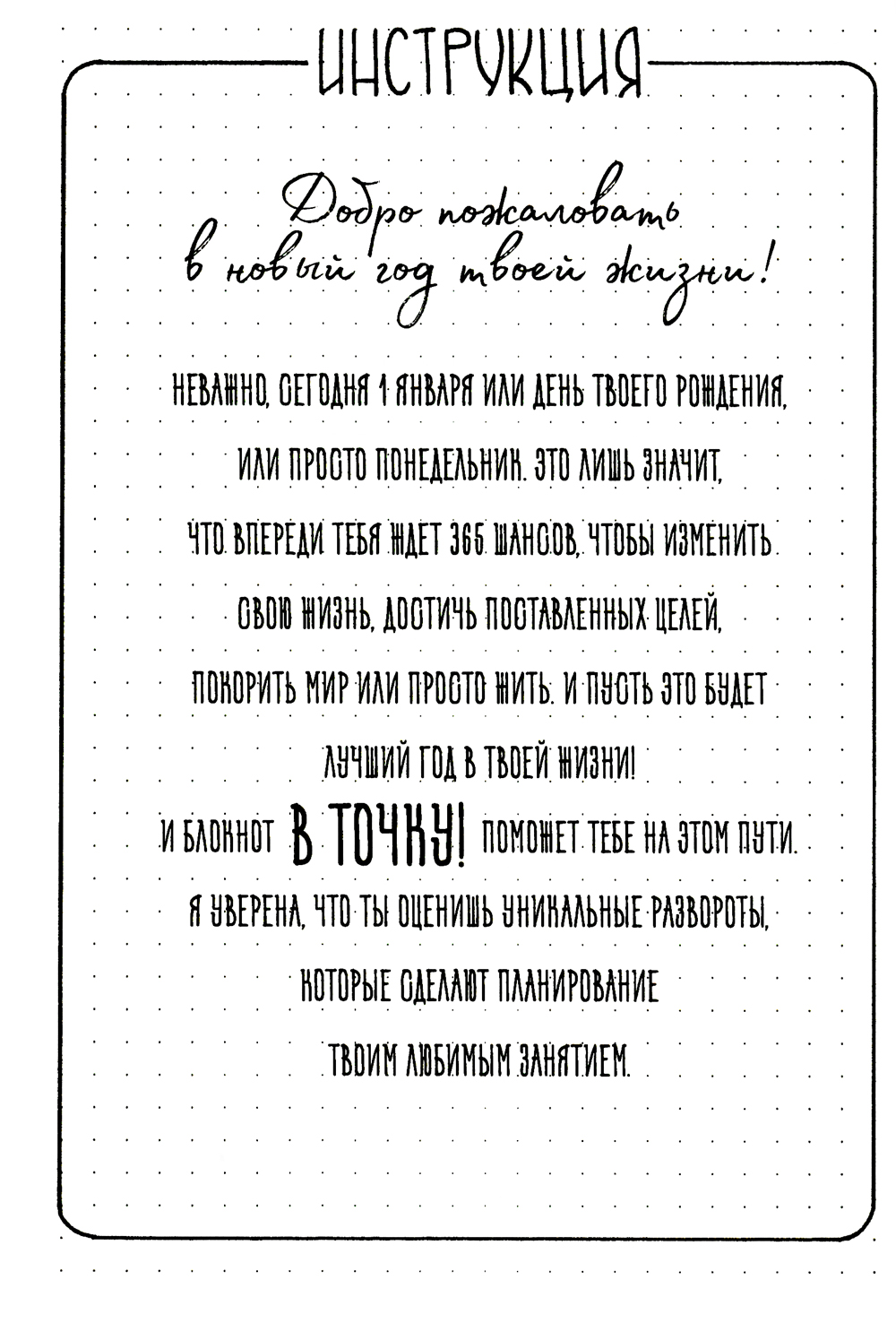 Неважно, сегодня 1 января или день рождения, или просто понедельник это лишь значит, что впереди тебя ждет 365 шансов, чтобы изменить свою жизнь, достичь поставленных целей, покорить мир или просто жить и пусть это будет лучший год в твоей жизни! И блокнот В ТОЧКУ! Поможет тебе на этом пути. Я уверена, что ты оценишь уникальные развороты, которые сделают планирование твоим любимым занятием.| Издательство | Новое небо |