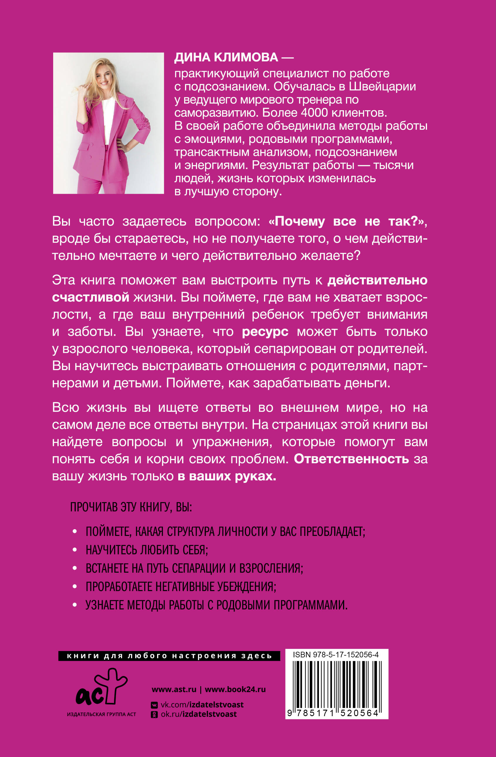 Дина Климова - практикующий специалист по работе с подсознанием. В своей работе объединила методы работы с эмоциями, родовыми программами, трансактным анализом, подсознанием и энергиями. Вы часто задаетесь вопросом: "Почему все не так?", вроде бы стараетесь, но не получаете того, о чем действительно мечтаете и чего действительно желаете? Книга "F#ck! Почему все не так? Как стать взрослым ресурсным человеком" поможет вам выстроить путь к действительно счастливой жизни. Вы поймете, где вам не хватает взрослости, а где ваш внутренний ребенок требует внимания и заботы. Вы узнаете, что ресурс может быть только у взрослого человека, который сепарирован от родителей. Вы научитесь выстраивать отношения с родителями, партнерами и детьми. Поймете, как зарабатывать деньги. Всю жизнь вы ищете ответы во внешнем мире, но на самом деле все ответы внутри. На страницах книги "F#ck! Почему все не так? Как стать взрослым ресурсным человеком" вы найдете вопросы и упражнения, которые помогут вам понять себя и корни своих проблем. Ответственность за вашу жизнь только в ваших руках. Прочитав эту книгу, вы: • поймете, какая структура личности у вас преобладает; • научитесь любить себя; • встанете на путь сепарации и взросления; • проработаете негативные убеждения; • узнаете методы работы с родовыми программами.| Издательство | ИЗДАТЕЛЬСТВО "АСТ" |