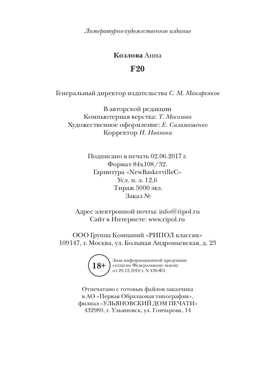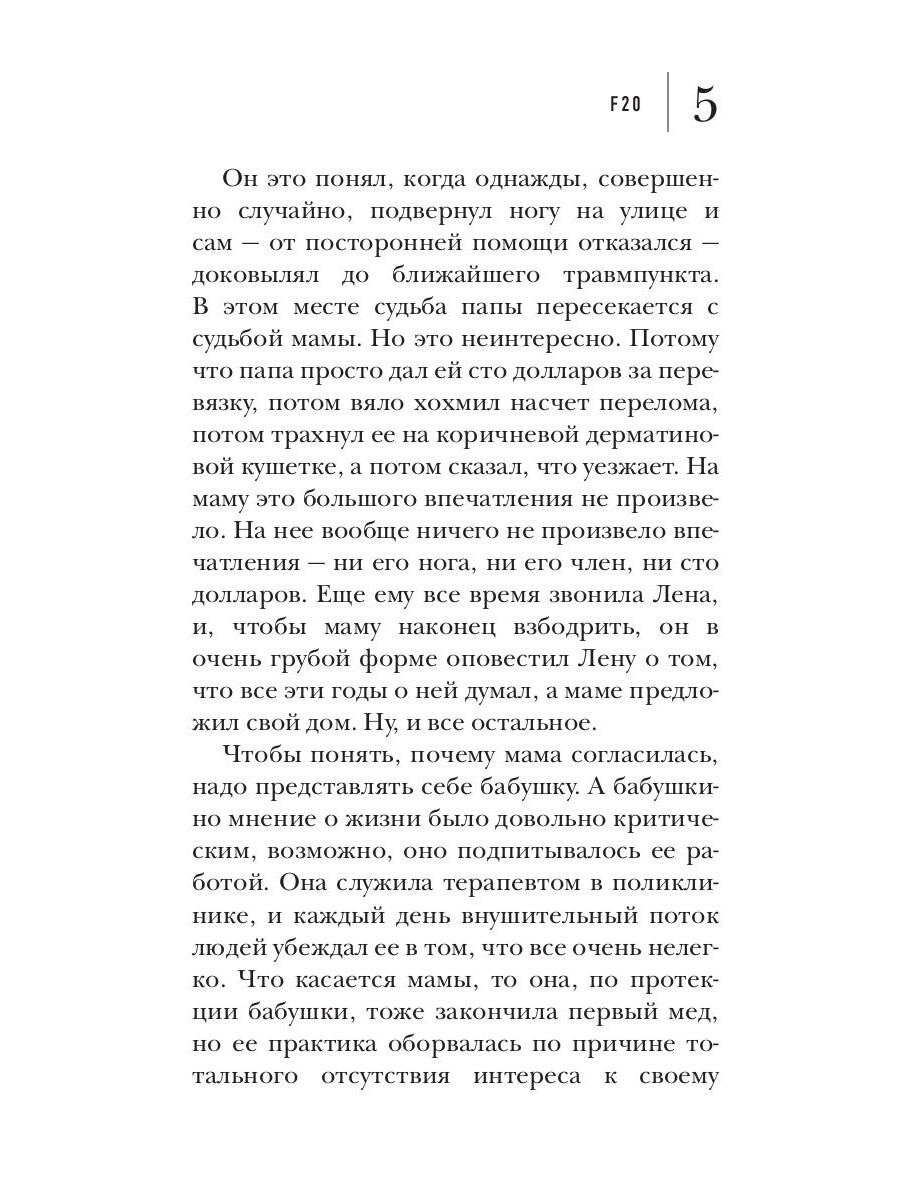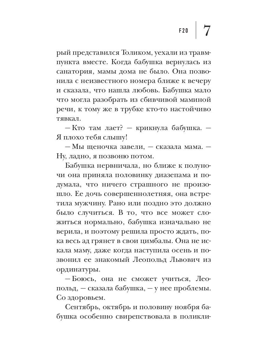 Новый роман Анны Козловой «F20» посвящен людям, про которых не пишут, и даже стараются не говорить. Их не берут на работу, на них не женятся, от них не хотят детей. Они больны, но никто не станет собирать деньги на их лечение, потому, что их болезнь страшнее рака, безнадежнее СПИДа, позорнее сифилиса. По коду МКБ f20 - это шизофрения.