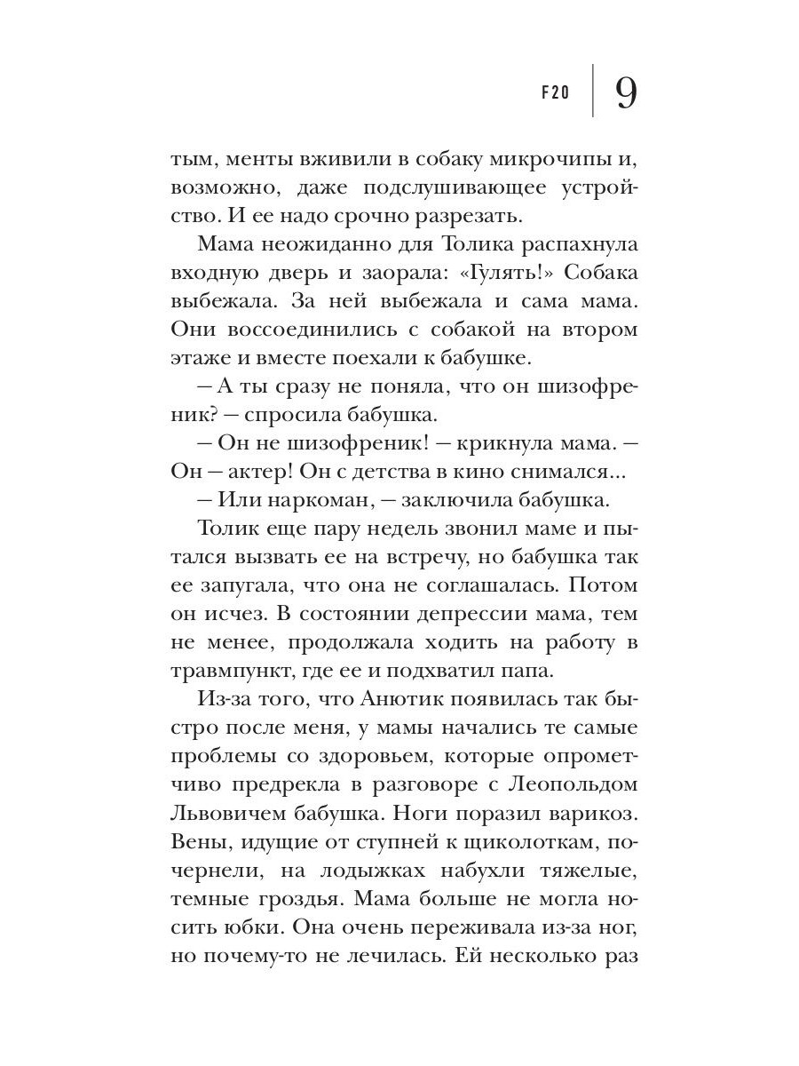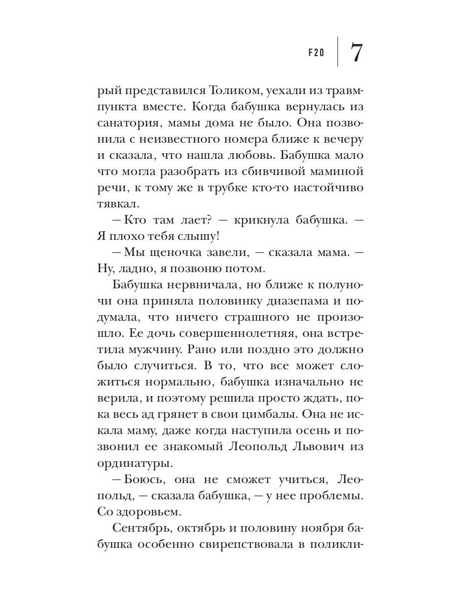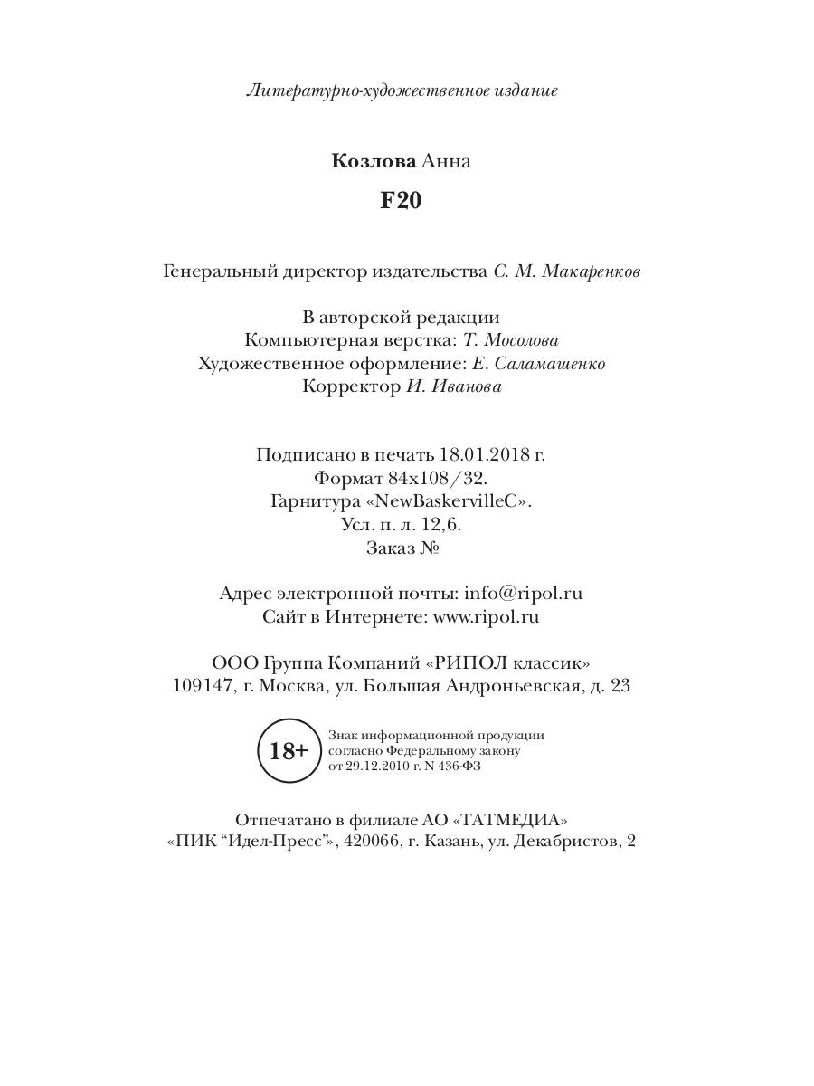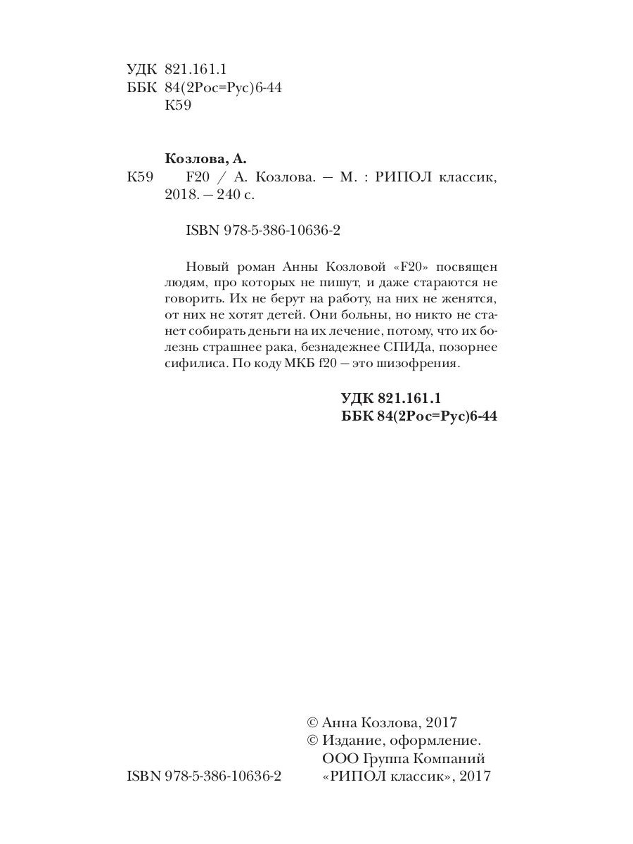 Новый роман Анны Козловой «F20» посвящен людям, про которых не пишут, и даже стараются не говорить. Их не берут на работу, на них не женятся, от них не хотят детей. Они больны, но никто не станет собирать деньги на их лечение, потому, что их болезнь страшнее рака, безнадежнее СПИДа, позорнее сифилиса. По коду МКБ f20 - это шизофрения.| Издательство | Рипол Классик |