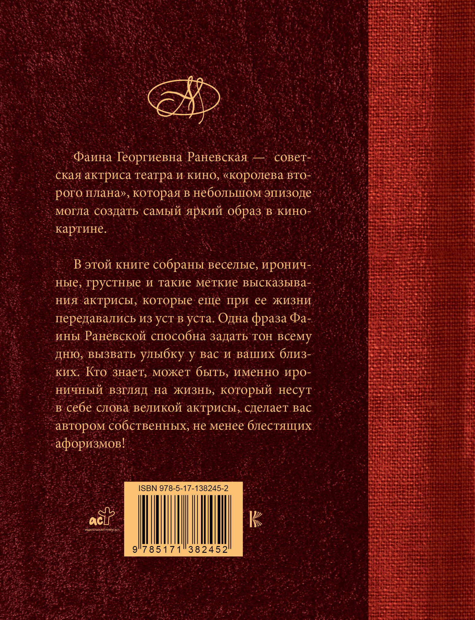 Фаина Георгиевна Раневская - советская актриса театра и кино, "королева второго плана", которая в небольшом эпизоде могла создать самый яркий образ в кинокартине. В этой книге собраны веселые, ироничные, грустные и такие меткие высказывания актрисы, которые еще при ее жизни передавались из уст в уста. Одна фраза Фаины Раневской способна задать тон всему дню, вызвать улыбку у вас и ваших близких. Кто знает, может быть, именно ироничный взгляд на жизнь, который несут в себе слова великой актрисы, сделает вас автором собственных, не менее блестящих афоризмов! А еще эта книга станет замечательным подарком для всех ценителей остроумных цитат и афоризмов.| Издательство | ИЗДАТЕЛЬСТВО "АСТ" |