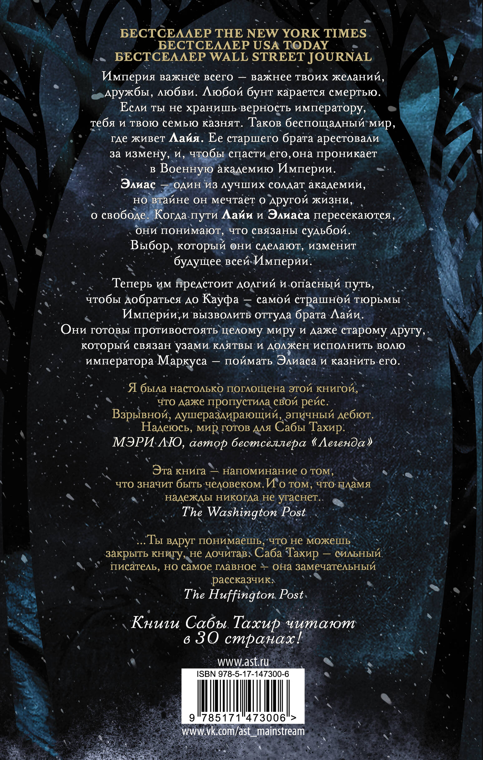 #2 тетралогии "Уголек в пепле" 1й роман этой серии получил Премию сайта Elbakin.net / Prix Elbakin.net, 2016 // Переводной подростковый роман фэнтези (Великобритания) → Уголёк в пепле / An Ember in the Ashes (2015) Отзывы читателей о книге "Факел в ночи" "Ещё больше погружения в историю и мир. Ещё больше экшна и накала страстей." В этой части больше внимания уделено мифологии, духам и магии, талантам людей, которые совершенно неожиданно начинают раскрываться. Эта часть о решениях, которые будут принимать герои. И об их последствиях. Итог? Вторая книга ещё глубже и интереснее первой.…" "Вторая книга смогла зацепить, увлечь и заинтриговать. Автор удерживает интригу и напряжение, оставляя интересные намеки." "В этой истории есть все: дружба, любовь, предательство и ненависть, немного магии. Не обошли стороной и семейные ценности. Мы сумеем увидеть семью Элиаса, о которой он всегда отзывается с теплом, безграничной нежностью, и семью Элен. Хотя к последней, как ни старалась, симпатией проникнуться все никак не могу еще с первой книги. Однако справедливости ради отмечу, что именно ее рост и развитие в книге «Факел в ночи» показали больше и грамотнее всего." Я была настолько поглощена этой книгой, что даже пропустила свой рейс. Взрывной, душераздирающий, эпичный дебют. Надеюсь, мир готов для Сабы Тахир. МЭРИ ЛЮ, автор бестселлера «Легенда» Эта книга - напоминание о том, что значит быть человеком. И о том, что пламя надежды никогда не угаснет. The Washington Post …Ты вдруг понимаешь, что не можешь закрыть книгу, не дочитав. Саба Тахир - сильный писатель, но самое главное - она замечательный рассказчик. The Huffington Post Книги Сабы Тахир читают в 30 странах!| Издательство | АСТ |