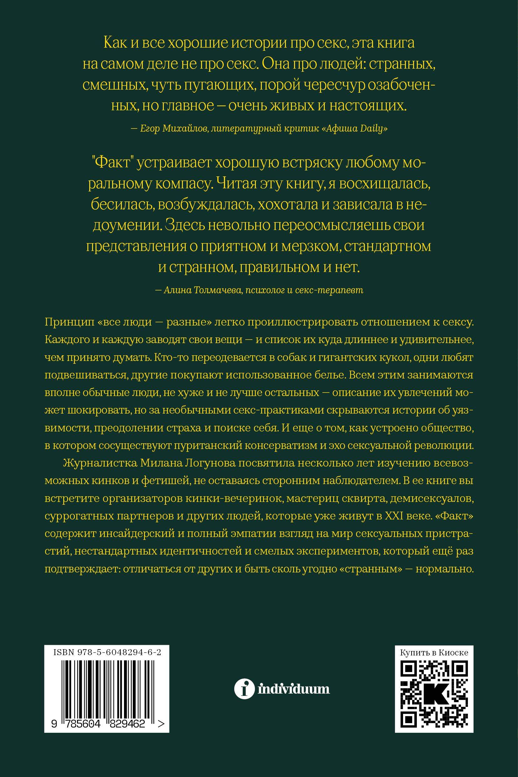 Принцип «Все люди разные» легко проиллюстрировать отношением к сексу. Каждого и каждую заводят свои вещи - и список их куда длиннее и удивительнее, чем принято думать. Кто-то переодевается в собак и живых кукол, одни любят подвешивания, другие покупают использованное белье. Всем этим занимаются вполне обычные люди, не хуже и не лучше остальных, - описание их увлечений может шокировать, но за необычными секс-практиками скрываются истории об уязвимости, преодолении страха и поиске себя. И еще о том, как устроено общество, в котором сосуществуют пуританский консерватизм и эхо сексуальной революции. Журналистка Милана Логунова посвятила несколько лет изучению всевозможных кинков и фетишей, не оставаясь сторонним наблюдателем. В ее книге вы встретите организаторов кинки-вечеринок, мастериц сквирта, демисексуалов, суррогатных партнеров и других людей, которые уже живут в XXI веке. «Факт» содержит инсайдерский и полный эмпатии взгляд на мир сексуальных пристрастий, нестандартных идентичностей и смелых экспериментов, который еще раз подтверждает: отличаться от других и быть сколь угодно «странным» - нормально.| Издательство | ИНДИВИДУУМ ПРИНТ ООО |