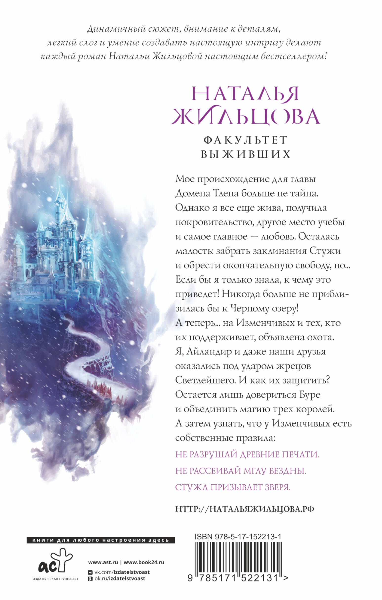 Мое происхождение для главы Домена Тлена больше не тайна. Однако я все еще жива, получила покровительство, другое место учебы и самое главное - любовь. Осталась малость: забрать заклинания Стужи и обрести окончательную свободу, но... Если бы я только знала, к чему это приведет! Никогда больше не приблизилась бы к Черному озеру! А теперь... на Изменчивых и тех, кто их поддерживает, объявлена охота. Я, Айландир и даже наши друзья оказались под ударом жрецов Светлейшего. И как их защитить? Остается лишь довериться Буре и объединить магию трех королей. А затем узнать, что у Изменчивых есть собственные правила: Не разрушай древние печати. Не рассеивай мглу бездны. Стужа призывает Зверя.