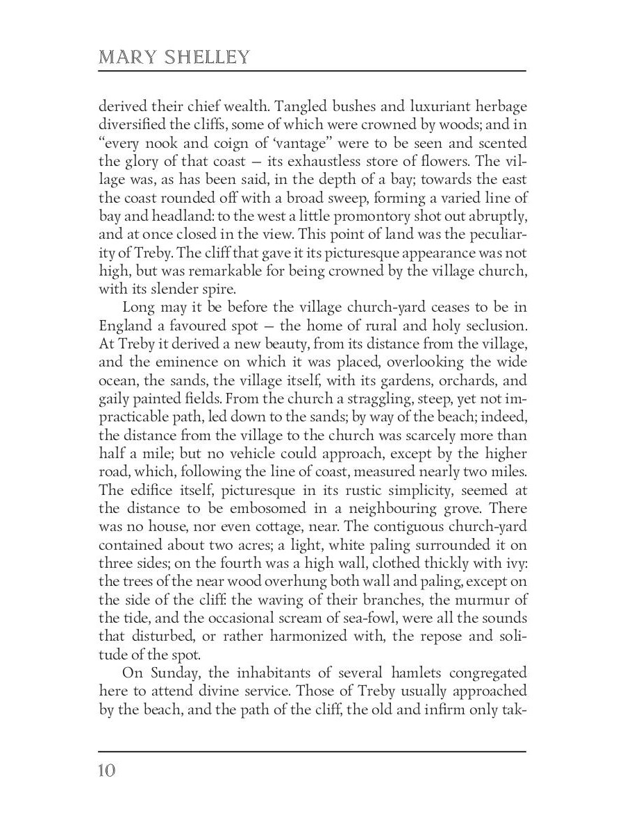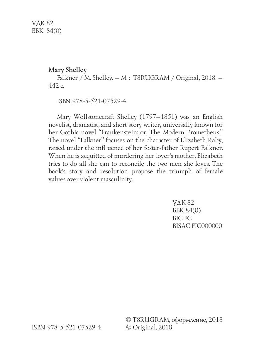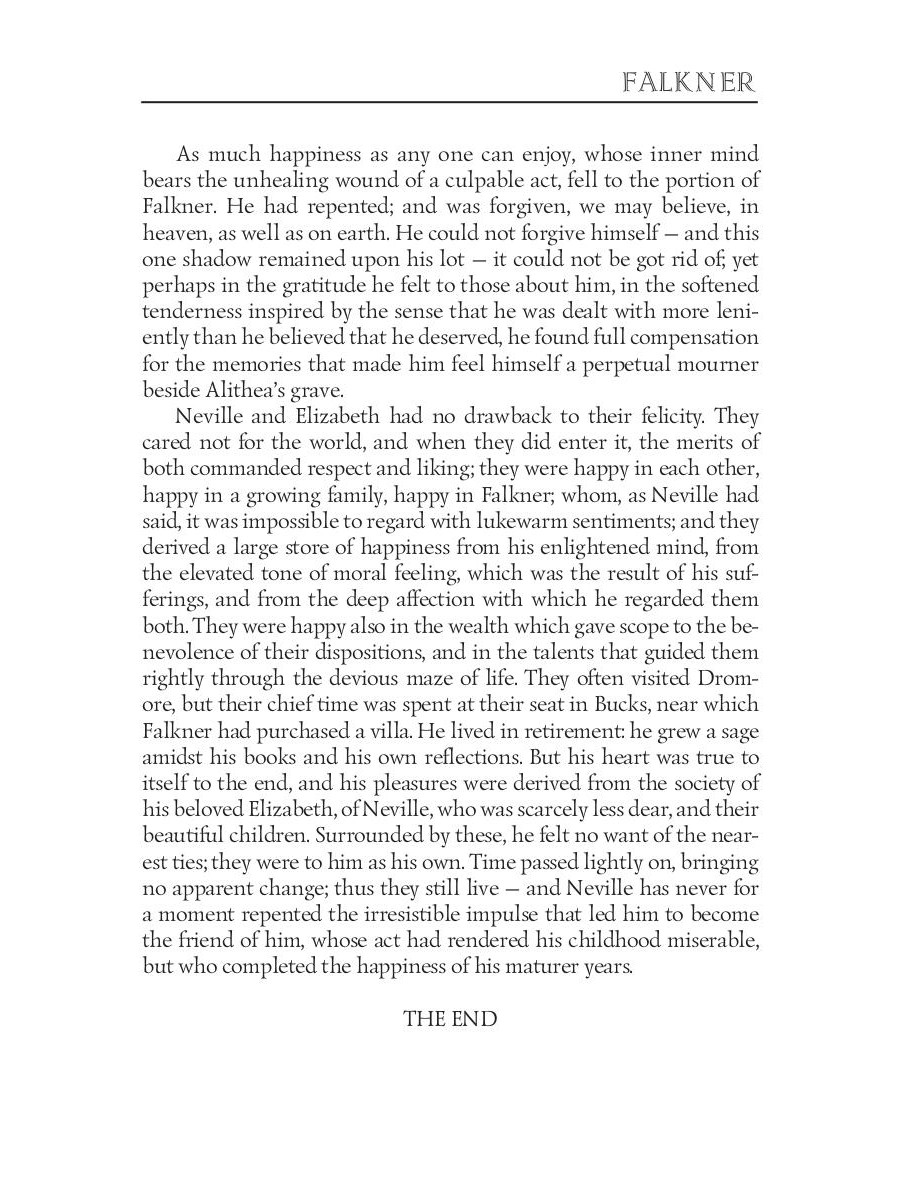 Mary Wollstonecraft Shelley (1797-1851) was an English novelist, dramatist, and short story writer, universally known for her Gothic novel "Frankenstein: or, The Modern Prometheus". The novel "Falkner" focuses on the character of Elizabeth Raby, raised under the infl uence of her foster-father Rupert Falkner. When he is acquitted of murdering her lover's mother, Elizabeth tries to do all she can to reconcile the two men she loves. The book's story and resolution propose the triumph of female values over violent masculinity.