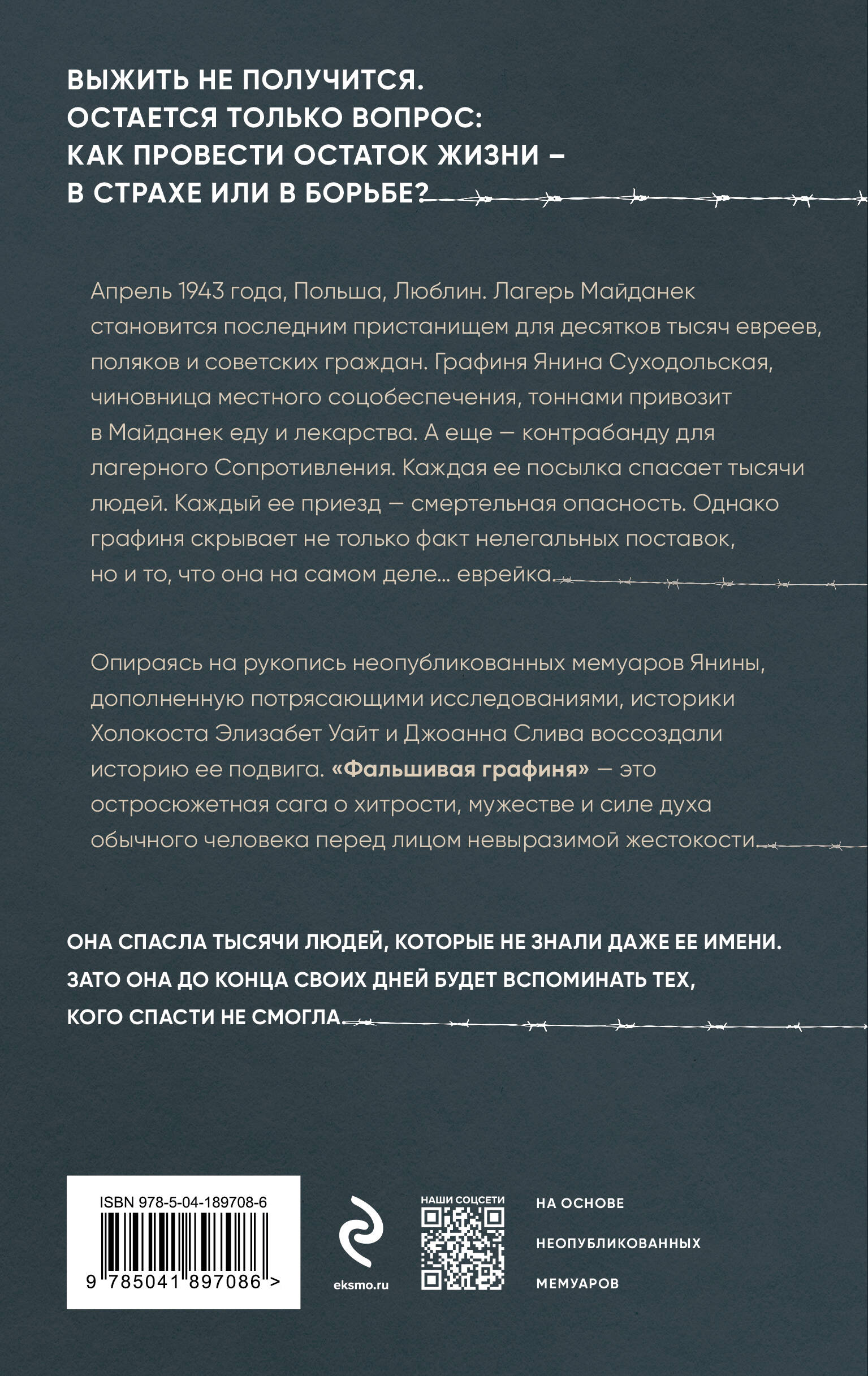 Невероятная история Янины Мельберг - еврейки, которая спасла тысячи жизней в лагере смерти Майданек, маскируясь под польскую аристократку, - основанная на ее неопубликованных мемуарах. Апрель 1943 года, Польша, Люблин. Лагерь Майданек становится последним пристанищем для десятков тысяч евреев, поляков и советских граждан. Графиня Янина Суходольская, чиновница местного соцобеспечения, тоннами привозит в Майданек еду и лекарства. А еще - контрабанду для лагерного сопротивления. Каждая ее посылка спасает тысячи людей. Каждый ее приезд - смертельная опасность. Однако графиня скрывает не только факт нелегальных поставок, но и то, что она на самом деле… еврейка. Под личиной «фальшивой графини» Суходольской узников спасает Пепи Спиннер - еврейка, решившая бросить вызов нацистам. С помощью хитрости, уговоров и железной настойчивости «графиня» убеждает чиновников СС не только принимать от нее поставки супа и хлеба (и даже украшенные рождественские елки), но и освободить тысячи поляков из концлагеря. Опираясь на рукопись неопубликованных мемуаров Янины, дополненную потрясающими исследованиями, историки Холокоста Элизабет Уайт и Джоанна Слива воссоздали историю ее подвига. «Фальшивая графиня» - это остросюжетная сага о хитрости, мужестве и силе духа обычного человека перед лицом невыразимой жестокости. «Эта книга - необычайное свидетельство мужества, стойкости и человечности в самые мрачные месяцы Холокоста. Эта захватывающая история, тщательно реконструированная двумя выдающимися историками Второй мировой войны, гарантирует, что мир не забудет выдающуюся Янину Мельберг и ее эпическую спасательную операцию, бросившую вызов великому злу. Вы не отложите эту книгу до самой последней страницы: это потрясающий фрагмент в истории Холокоста, который запомнится надолго после прочтения». - Дебби Сензипер, журналист, лауреат Пулитцеровской премии| Издательство | ООО "Издательство "Эксмо" |