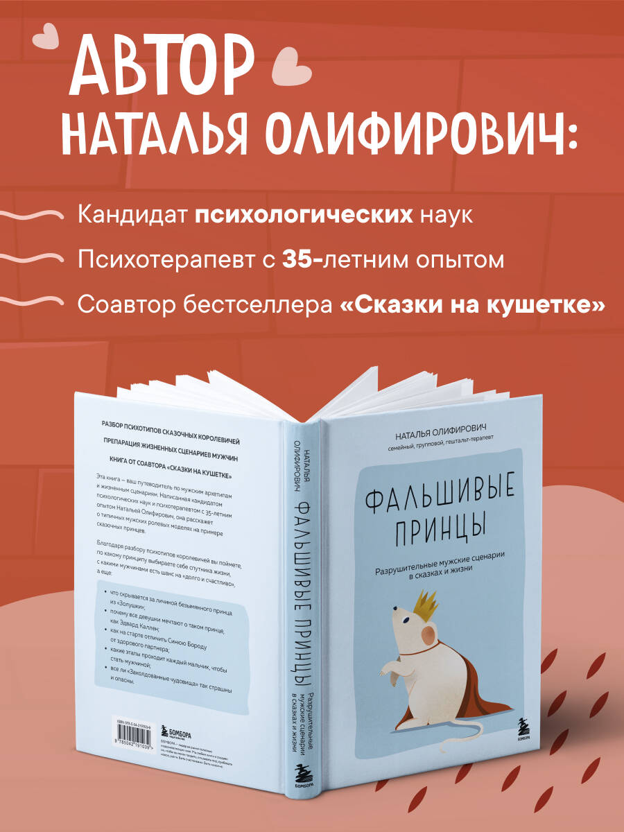 РАЗБОР ПСИХОТИПОВ СКАЗОЧНЫХ КОРОЛЕВИЧЕЙ. ПРЕПАРАЦИЯ ЖИЗНЕННЫХ СЦЕНАРИЕВ МУЖЧИН. КНИГА ОТ СОАВТОРА «СКАЗКИ НА КУШЕТКЕ». Эта книга - ваш путеводитель по мужским архетипам и жизненным сценариям. Написанная кандидатом психологических наук и психотерапевтом с 35-летним опытом Натальей Олифирович, она расскажет о типичных мужских ролевых моделях на примере сказочных принцев. Благодаря разбору психотипов королевичей вы поймете, по какому принципу выбираете себе спутника жизни, с какими мужчинами есть шанс на «долго и счастливо», а еще: - что скрывается за личиной безымянного принца из «Золушки»; - почему все девушки мечтают о таком принце, как Эдвард Каллен; - как на старте отличить Синюю Бороду от здорового партнера; - какие этапы проходит каждый мальчик, чтобы стать мужчиной; - все ли «Заколдованные чудовища» так страшны и опасны.| Издательство | ООО "Издательство "Эксмо" |