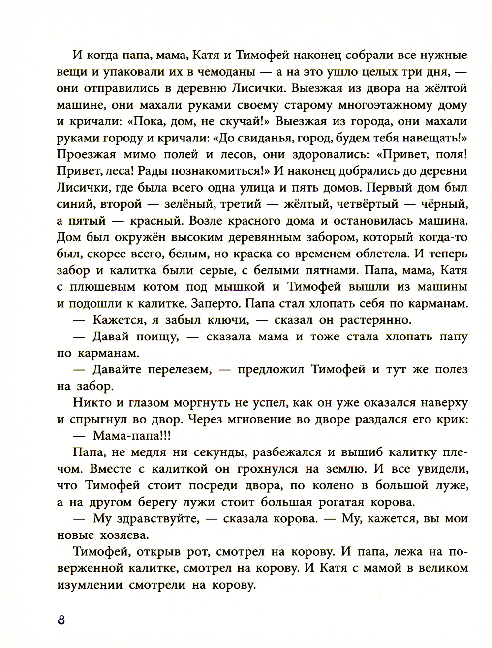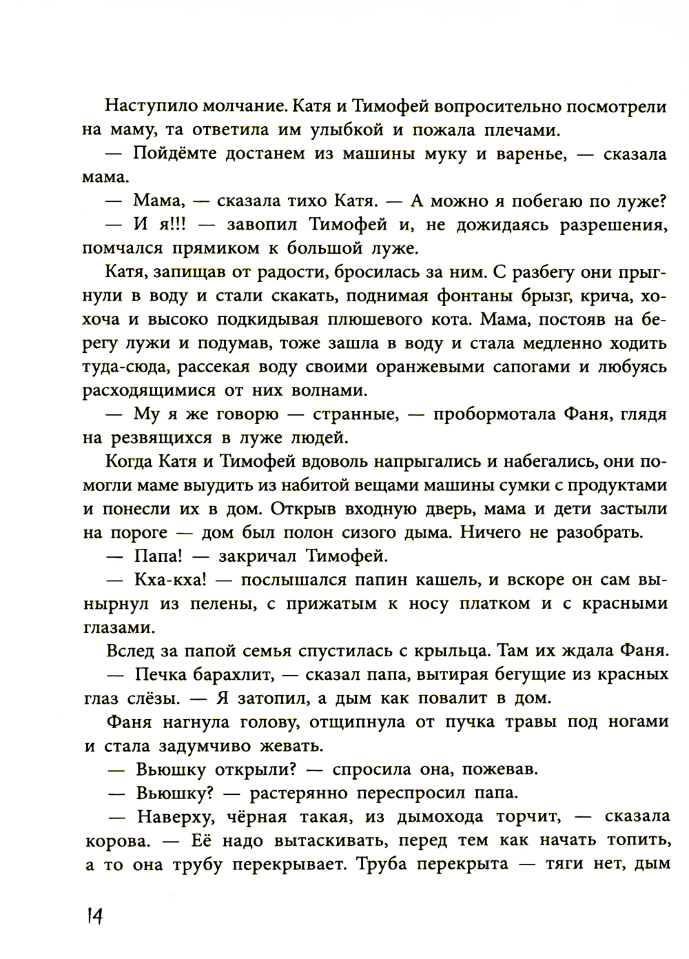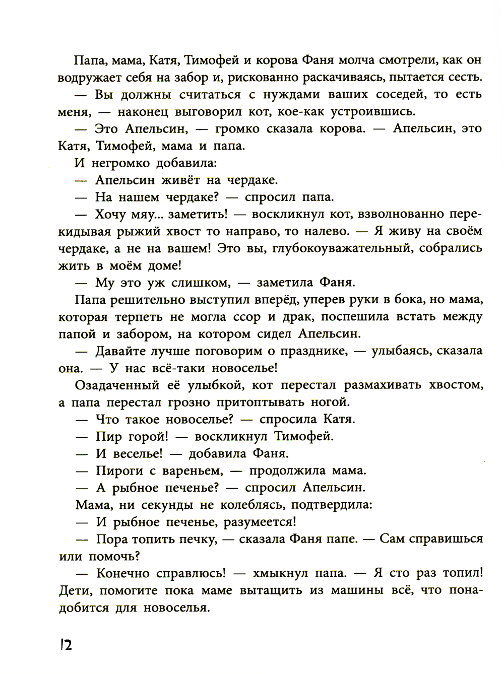 Дружная семья - папа, мама, девочка Катя и мальчик Тимофей - перебирается из большого-пребольшого города в маленькую-премаленькую деревню. И не на летние каникулы, как вы могли бы подумать, а насовсем! Мечта о спокойном переезде из квартиры в многоэтажке в уютную избушку с печкой развеялась очень скоро. Оказалось, что в их доме уже есть давнишние жильцы - невозмутимая корова Фаня и сварливый кот Апельсин! Новым хозяевам нужно найти общий язык с говорящими животными, подружиться с необычными соседями и мно-о-огому научиться. Деревенские приключения, которые и не снились городским лежебокам, начинаются! Книга с иллюстрациями Леонида Гамарца.| Издательство | Акварель |