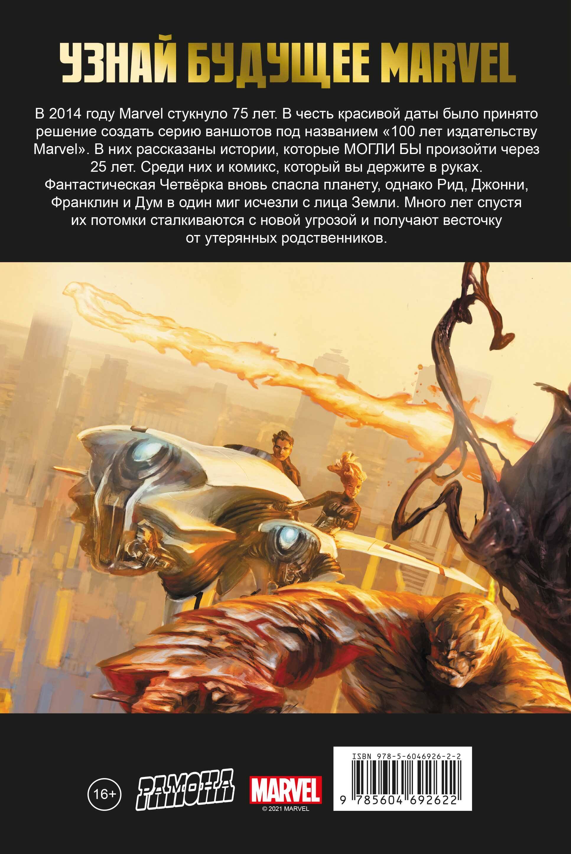 В 2014 году Marvel стукнуло 75 лет. В честь красивой даты было принято решение создать серию ваншотов под названием «100 лет издательству Marvel». В них рассказаны истории, которые МОГЛИ БЫ произойти через 25 лет. Среди них и комикс, который вы держите в руках. Фантастическая Четвёрка вновь спасла планету, однако Рид, Джонни, Франклин и Дум в один миг исчезли с лица Земли. Много лет спустя их потомки сталкиваются с новой угрозой и получают весточку от утерянных родственников.| Издательство | ООО "Издательство "Эксмо" |