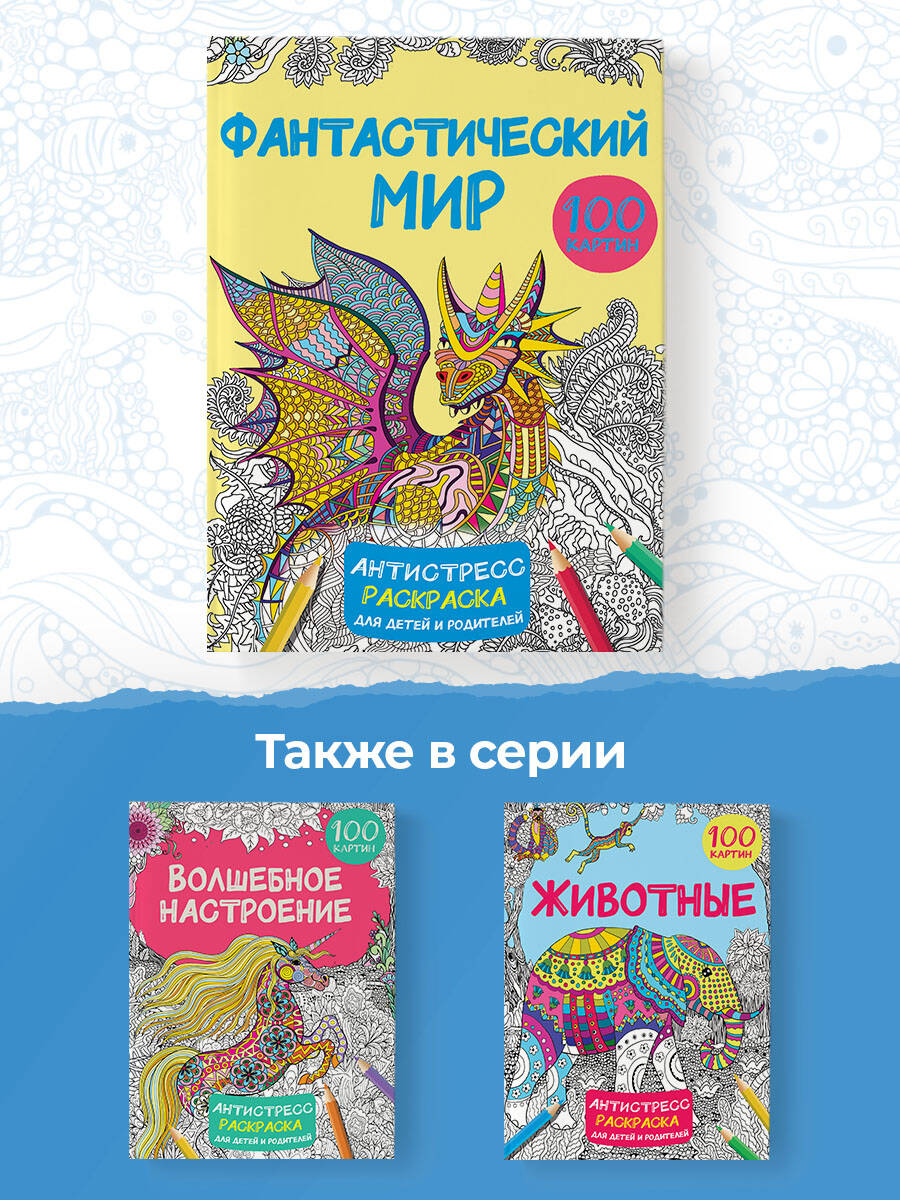 Антистресс-раскраски - один из лучших способов победить стресс и расслабиться после трудного дня.Детям они помогают снизить уровень тревожности, выработать усидчивость и проявить творческие способности. «Фантастический мир. 100 картинок» - замечательная антистресс-раскраска для расслабляющего отдыха. На рисунках - герои волшебных историй, невероятные существа и фантастические узоры. Всего - более 100 картинок с запутанными орнаментами и обилием мелких деталей. Работа с мелкими объектами позволяет полностью погрузиться в процесс раскрашивания и отвлечься от дел. Раскраска отлично подойдёт как для детей, так и для их родителей.| Издательство | ИЗДАТЕЛЬСТВО "АСТ" |