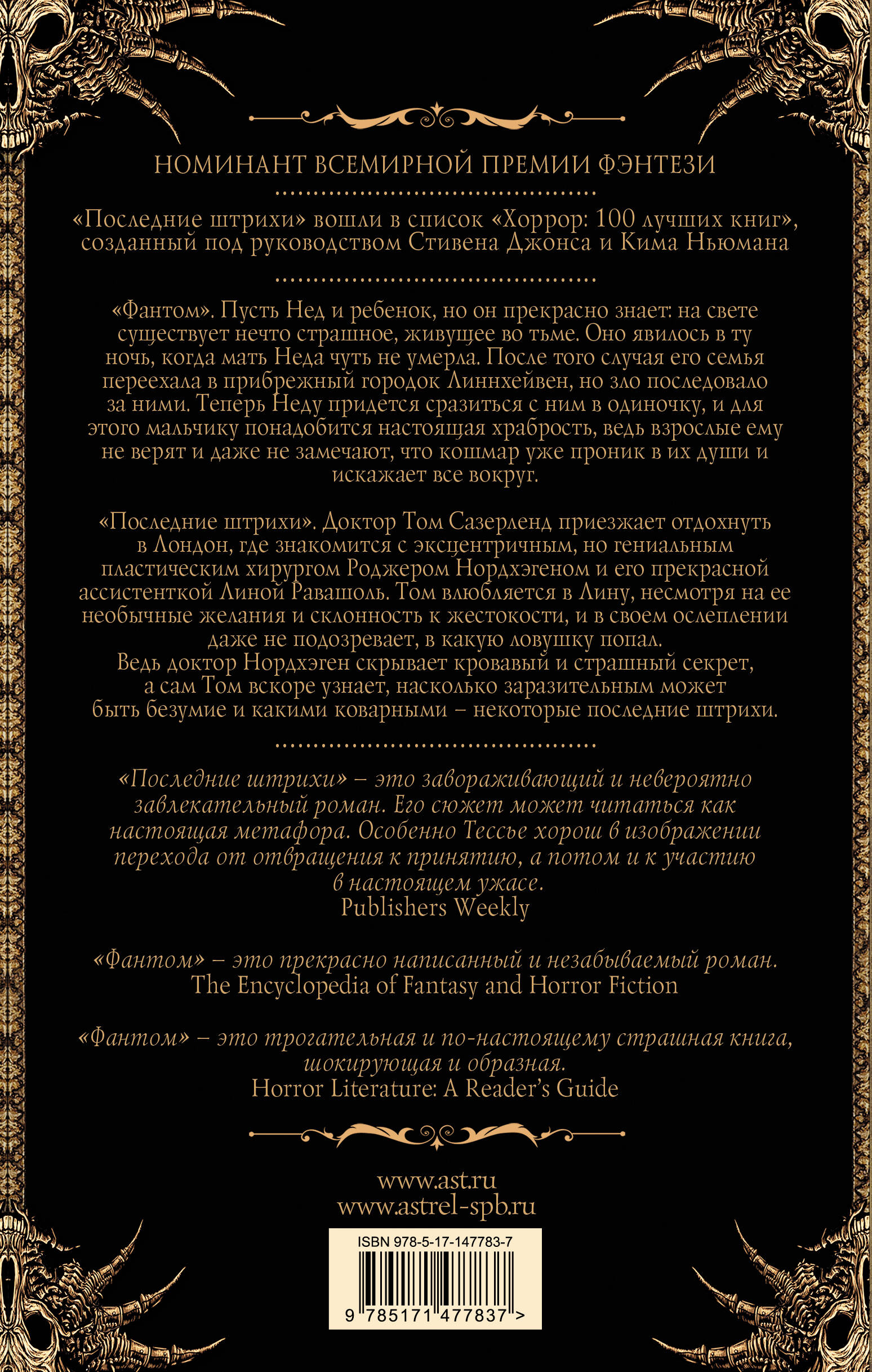 От призрака не спрячешься под одеялом. От него нельзя убежать. Ночью он выйдет из-за двери, выберется из-под кровати, залезет в детскую через окно. Он доберётся до маленького Неда Ковингтона. Пусть Нед почувствует, как ледяная пустота дотрагивается до него. Пусть он испугается. Пусть он умрёт. Пусть наглый, глупый Том Сазерленд, это ничтожество, побегает за Линой! О, она приведёт его в ад. Там, где властвуют смерть и кровь, он послужит великой цели… Два классических и совершенно разных хоррора под одной обложкой. Строго 18+. Не для слабонервных!| Издательство | Издательство "АСТ" |