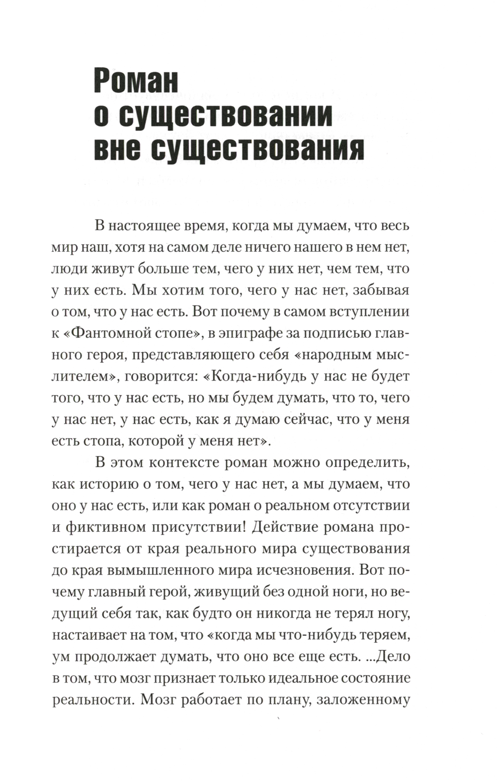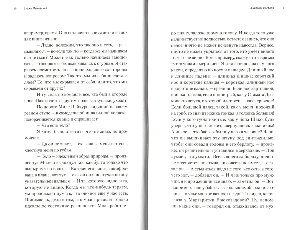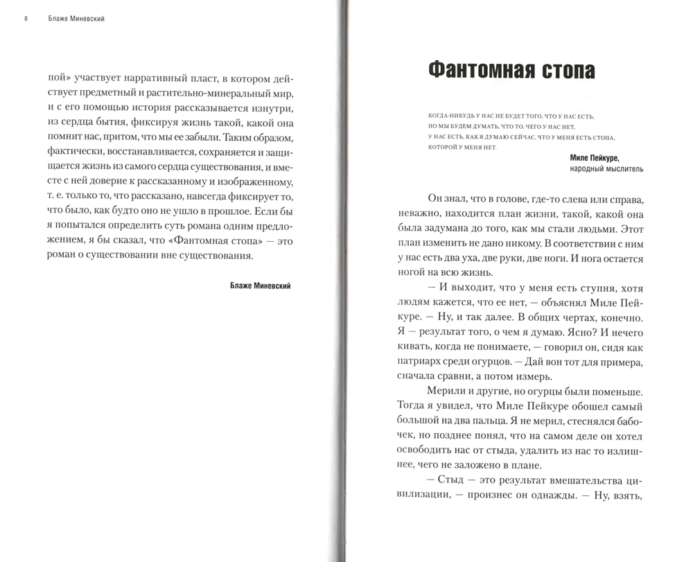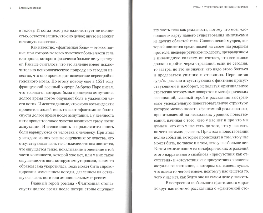 Роман македонского писателя и драматурга Блаже Миневского (род. 1961) можно определить как текст о реальном отсутствии и фиктивном присутствии. Автор называет книгу романом о существовании вне существования. Переплетая судьбы героев, Миневский, используя стратегию остроумных поворотов и метафорических ассоциаций, выстраивает увлекательную повествовательную структуру, которую можно назвать "фантомной реальностью". Герой-рассказчик, живущий без ноги, ведет себя так, будто никогда ее не терял, потому что мозг "дополняет" карту существования импульсами из других частей тела. Издание адресовано всем ценителям современного македонского романа и зарубежной прозы XXI в.