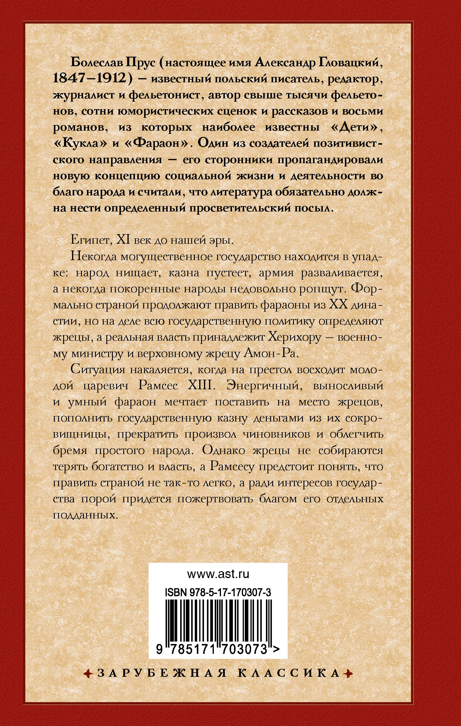 - Болеслав Прус - популярный польский писатель второй половины XIX века, автор книг «Дети», «Кукла» и «Форпост». - «Фараон» - один из самых известных романов автора. - Для всех поклонников исторических романов и книг о Древнем Египте. - Издание в серии «Лучшая мировая классика» - в твердой обложке и строгом оформлении.| Издательство | Издательство "АСТ" |